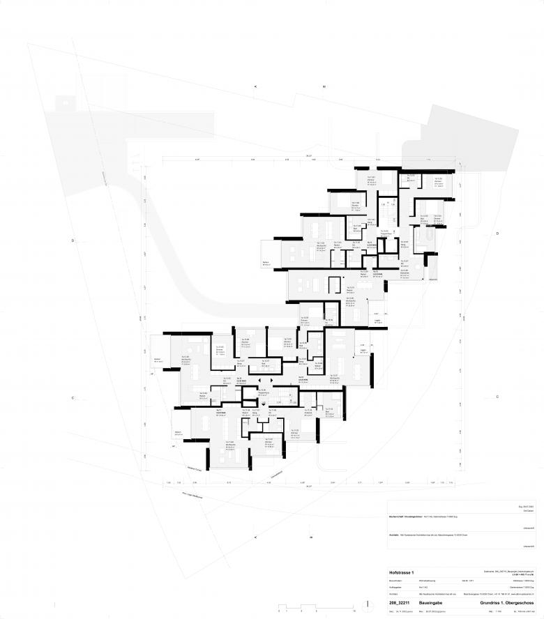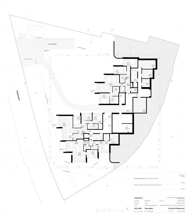 Die zwei bestehenden Wohnhäuser auf dem Grundstück sollen durch einen Neubau ersetzt werden. Auf Grund einer Dienstbarkeit im nordwestlichen Teil des Grundstücks wird der Neubau analog den Bestandsbauten in den südwestlichen und nordöstlichen Teil der Parzelle platziert. Im Nordwesten entlang der Hofstrasse wird so ein grosszügiger, parkartiger Zugangsraum zum Gebäude formuliert. Hier befinden sich neben dem Zugangsweg zum Gebäude die Vorfahrt mit der Ein- und Ausfahrt zur Tiefgarage, die Besucherparkplätze und die Kurzzeitabstellplätze für Velos sowie eine Frei- und Aufenthaltsfläche als Begegnungszone für die Bewohner.