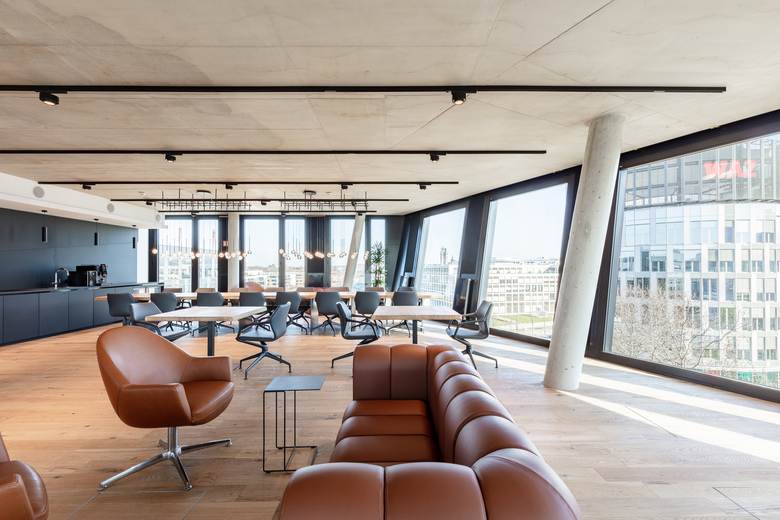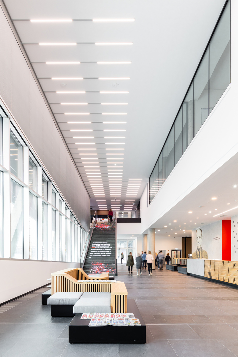 Ein veritables Ausrufezeichen! Das neueröffnete Headquarter der international tätigen Funke Mediengruppe verweist auf ein kohärentes städtebauliches Areal, das sich wie ein wohlproportionierter Körper zu einem großen Ganzen fügt. Sein Kopf: der Funke Medienturm, der überdies die größte Newswall in Deutschland beherbergt. Seine Finger: die umliegenden Baukörper, deren vielfältige Nutzungsmöglichkeiten einen maßgeblichen Faktor in der Planung darstellten. Diesem Ansinnen folgend, umfasst das Ensemble etwa öffentliche Bereiche wie Foyers, Restaurants und Konferenzräumlichkeiten genauso wie Plätze des Verweilens und des Erholens. Im Innenbereich schreibt sich der ausgeprägte Planungsgedanke indes in die unterschiedlichen Nutzflächen ein: Redaktionen treffen auf Büros, eine Kindertagesstätte oder Schulungsräume. Basierend auf den Farben Schwarz, Silber und Weiß spürt das Gestaltungskonzept außerdem dem Prozess des Druckens nach – im übertragenen Sinne manifestiert sich Druckerschwärze hier mittels silberner Stempel auf weißem Papier. Als architektonische Fußnote unterstreichen großflächig verlegte Betonwerksteine im mit Wasserbecken, dicht gepflanzten Baumreihen und hofartigen Grünbereichen durchsetzten Außenbereich obendrein den urbanen Gesamtcharakter der neuen Unternehmenszentrale. Das Funke Media Office – ein zwischen den Essener Stadtteilen Grüne Mitte und Berliner Platz gelegenes Ensemble, das sich im harmonischen Zusammenspiel seiner (Satz-)Teile als weltgewandtes Statement mit Neuigkeitswert lesen lässt.