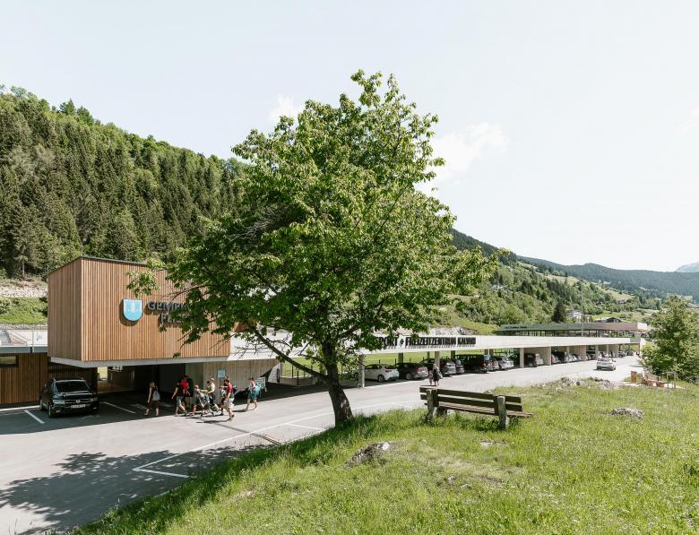 20 years after their village center project, AllesWirdGut now completed another gem of communal architecture in the village of Fließ in Tyrol. Within walking distance from the school and the village center, a mountain arena was built for the local soccer club, which includes a tournament and a training pitch, a grandstand, swimming pool, track-and-field, tennis, and trend sports facilities as well as an identity-establishing landmark clubhouse. The topography and the shape of the site called for sensitive interventions and a sparing use of existing developable areas. Suspended horizontal planes — the leitmotif of the design — were placed on and above and off the edges of the mountain flank. Suspended floor slabs also inform the appearance of the clubhouse. With its distinctive layering of constructive elevations, the eye-catcher of the sports center sits on the terraced alpine slope, while the basement and ground floors are firmly embedded in the topography. The ground floor level accommodates locker rooms, premises for trainers and referees, showers and restrooms. Covered outdoor stairs take visitors from the main entrance at pitch level to the upper floor: the pavilion-like built volume is home to the club restaurant with a bar and dining area: It has full-height glazing and an all-around balconied terrace, which not only overlooks what is happening on the pitch — the exposed outdoor areas also offer a breath-taking 360-degree panorama view.