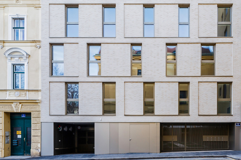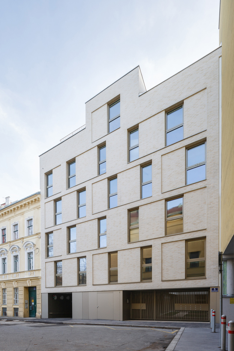 Durch raffinierte Details und hochwertige Materialien besticht ein Wohnbau in der Frauenheimgasse im 12. Bezirk. Mit dem Sockel aus bronzefarbenen Aluminiumpaneelen im Erdgeschoss wirkt die Straßenfassade aus erdigem, sandfarbenen Klinker besonders elegant und fügt sich harmonisch in den umgebenden Bestand ein. Die zu den angrenzenden Altbaufassaden analoge Reliefierung greift deren dekorative Stuckstruktur auf zeitgenössische Weise auf und zeigt eine spannende Neuinterpretation. Versetzte französische Fenster sind ein weiteres prägendes Element der Fassade.
