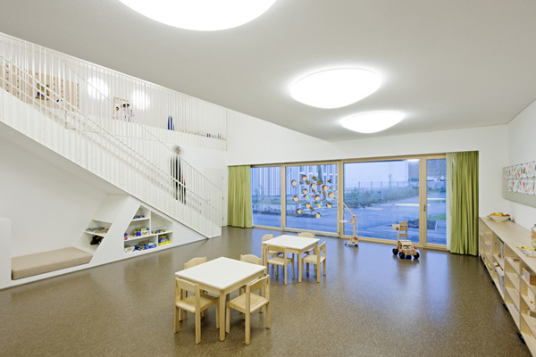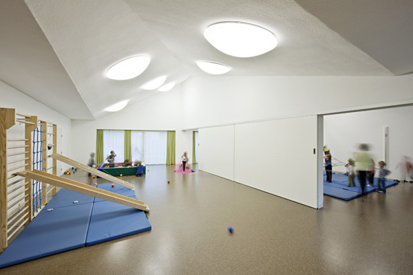 Die Gruppenräume bieten für jede Lust und Laune den richtigen Rahmen: hell - dunkel, hoch - niedrig, steil – flach… Panoramafenster über die volle Raumbreite erweitern die „Zimmer“ in den Garten. Farben und Materialien sind erdig und warm. Wir liefern den Rahmen, der alles offen lässt: Das Bild erschaffen die Kinder ständig neu. Work in progress.