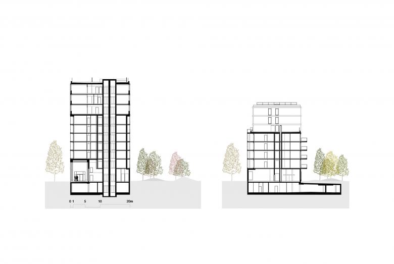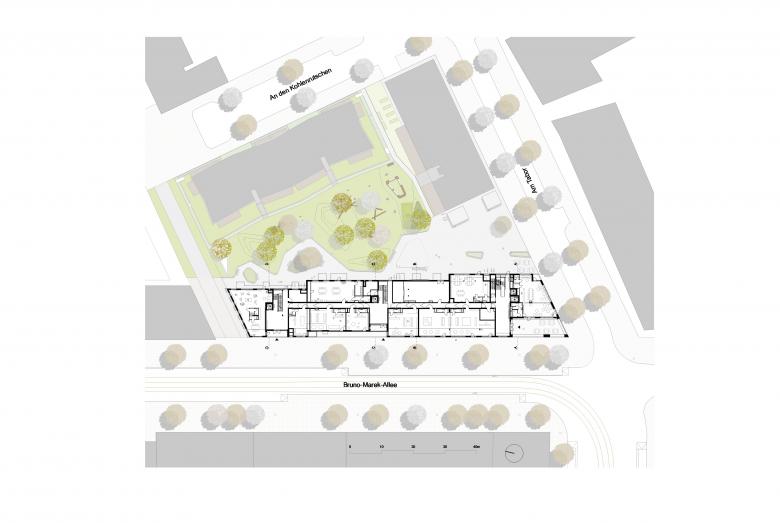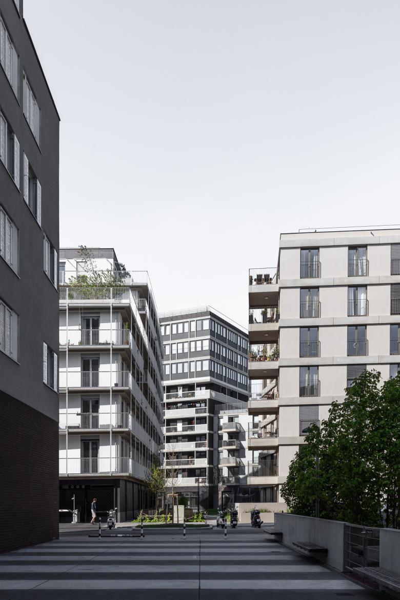 Mit dem Wohn- und Geschäftshaus am Nordbahnhof legt AllesWirdGut einen Grundstein in einem der aufregendsten Stadtentwicklungsgebiete Wiens. Entlang der neuen Bruno-Marek-Allee an der Ecke Am Tabor entstand ein Ensemble mit bis zu 35 Metern Höhe. Entsprechend dem proklamierten städtebaulichen Leitbild weist der Baukörper gestaffelte und kleinteilig strukturierte Gebäudefluchten und -höhen auf. Durch einen ausdifferenzierten Nutzungsmix von Gewerbeflächen und rund 100 leistbaren Wohneinheiten soll er zudem zum Florieren der neuen Allee beitragen: So bietet der Stadtsockel Geschäfts- und Gastronomieflächen im Erdgeschoß sowie flexibel nutzbare Wohn- und Gewerbeflächen im ersten Obergeschoß. Die letzten Ebenen im 35 Meter hohen Kopfbau sind als Büroflächen mit herrlichem Panoramablick geplant. Von der Allee abgewandt bildet das Gebäude zusammen mit den beiden gegenüberliegenden Wohnhäusern zudem einen ruhigen, aber durchgängigen Freiraum – ein sonniger, dicht begrünter Park als gemeinsames Zentrum!