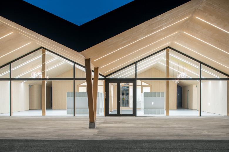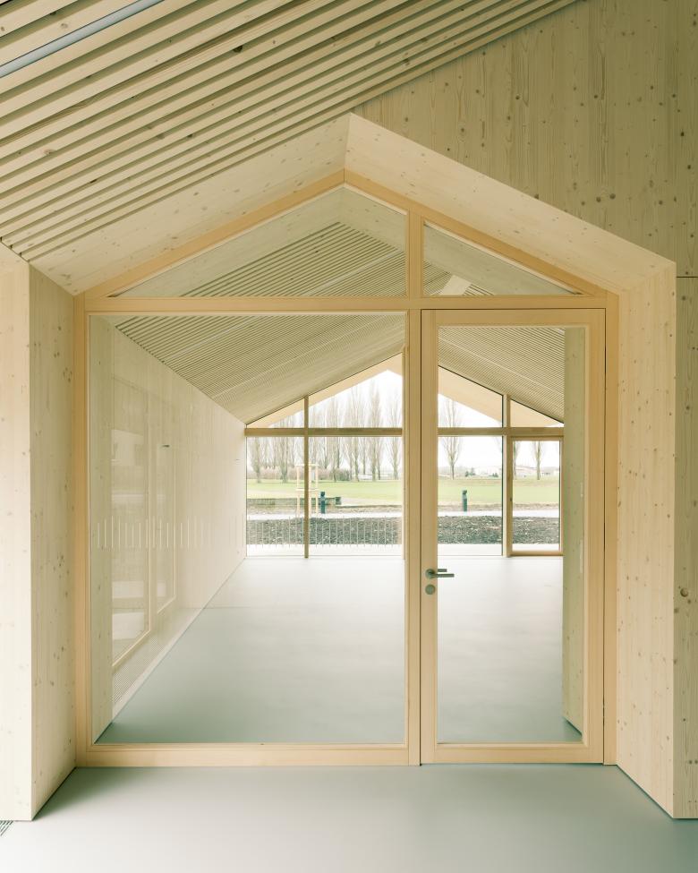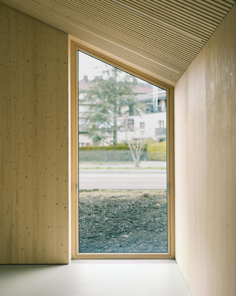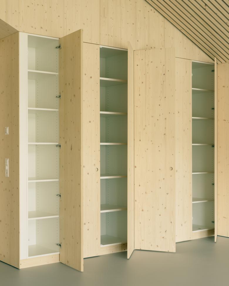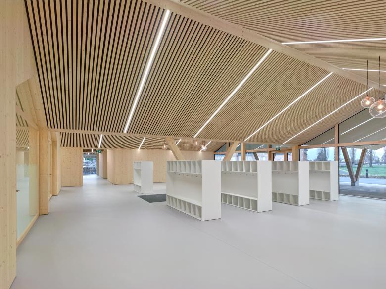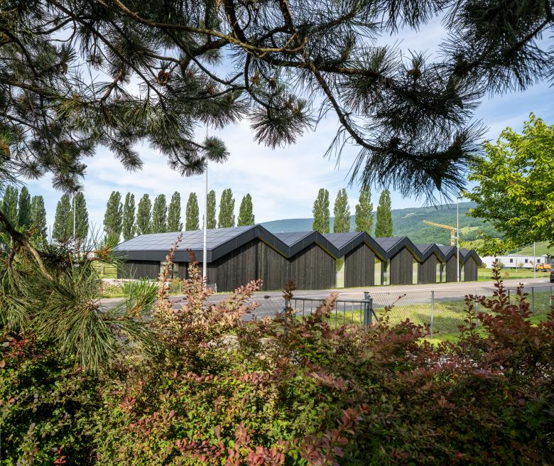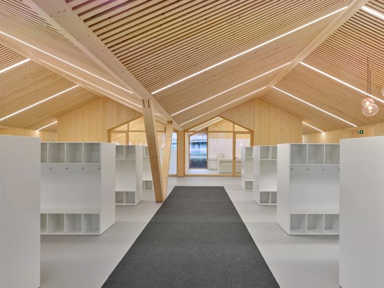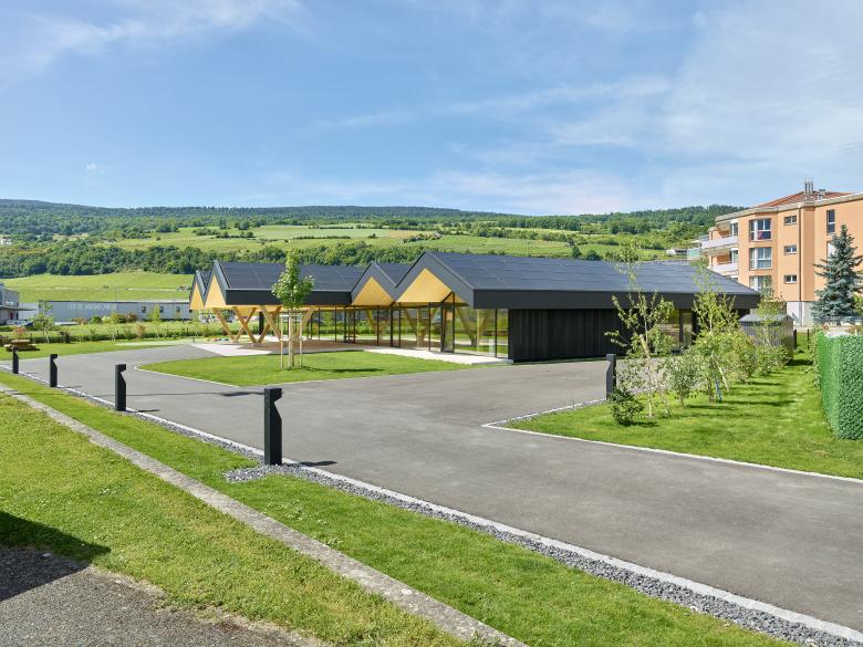 La structure et les façades du bâtiment sont réalisées en bois provenant des forêts communales, assemblées en construction modulaire préfabriquée. Outre le bilan écologique intéressant d’une telle construction, elle offre l’avantage de pouvoir être mise en œuvre par tous temps en atelier, réduisant le temps de construction sur place ainsi que la durée des nuisances dans un site sensible, fréquenté par de nombreux élèves de tout âge.