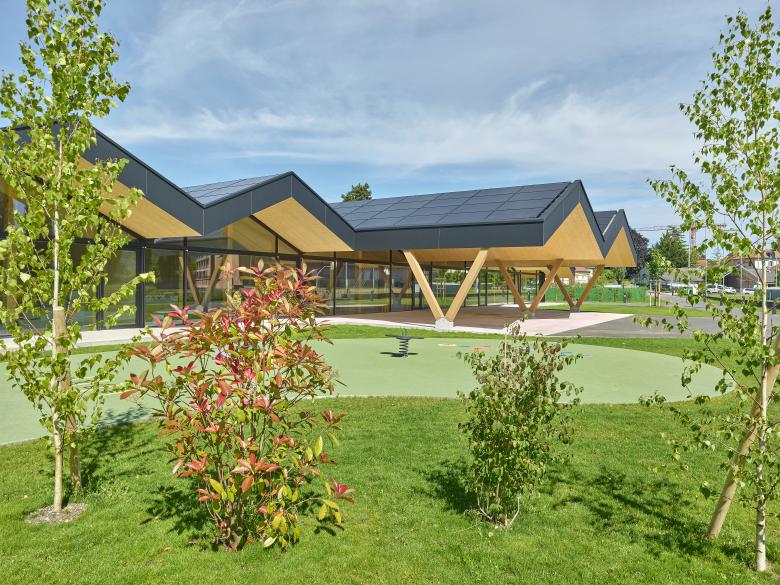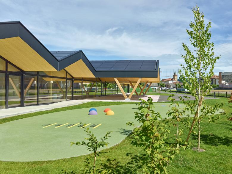Prévu pour l’accueil de cent enfants, le bâtiment est composé d’un seul niveau coiffé d’une toiture à doubles pans multiples. Cette couverture se prolonge en porte-à-faux au Sud offrant la protection solaire estivale pour la façade vitrée, et s’agrandit au niveau du corps central pour créer un préau couvert qui marque l’entrée de l’établissement.
