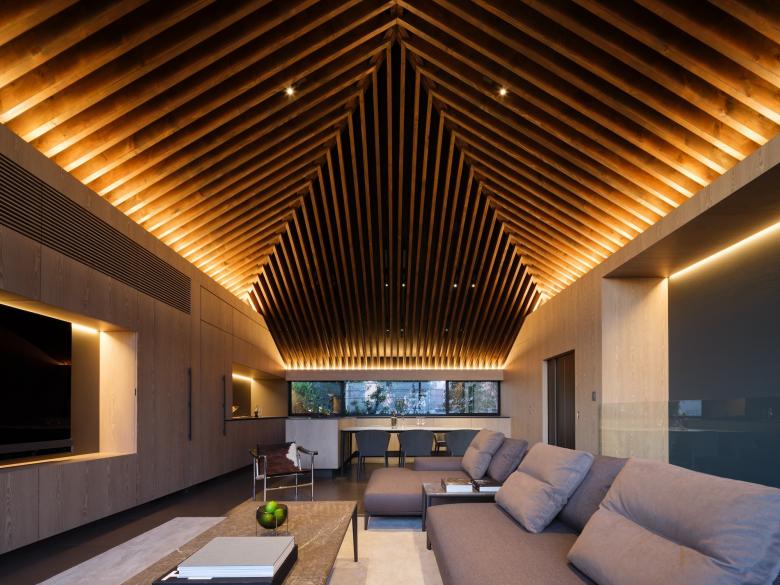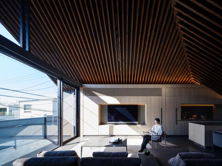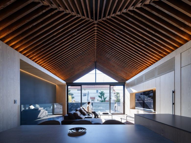 2階には家族全員が集まり、団欒ができる一室空間のパブリックルームを配置。寄棟&切妻屋根の天井垂木が特徴的で、南側リビングに設けた5角形の開口部から自然光が注がれ、その反射光がストライプ柄の天井垂木面に美しいグラデーションをつくりあげている。