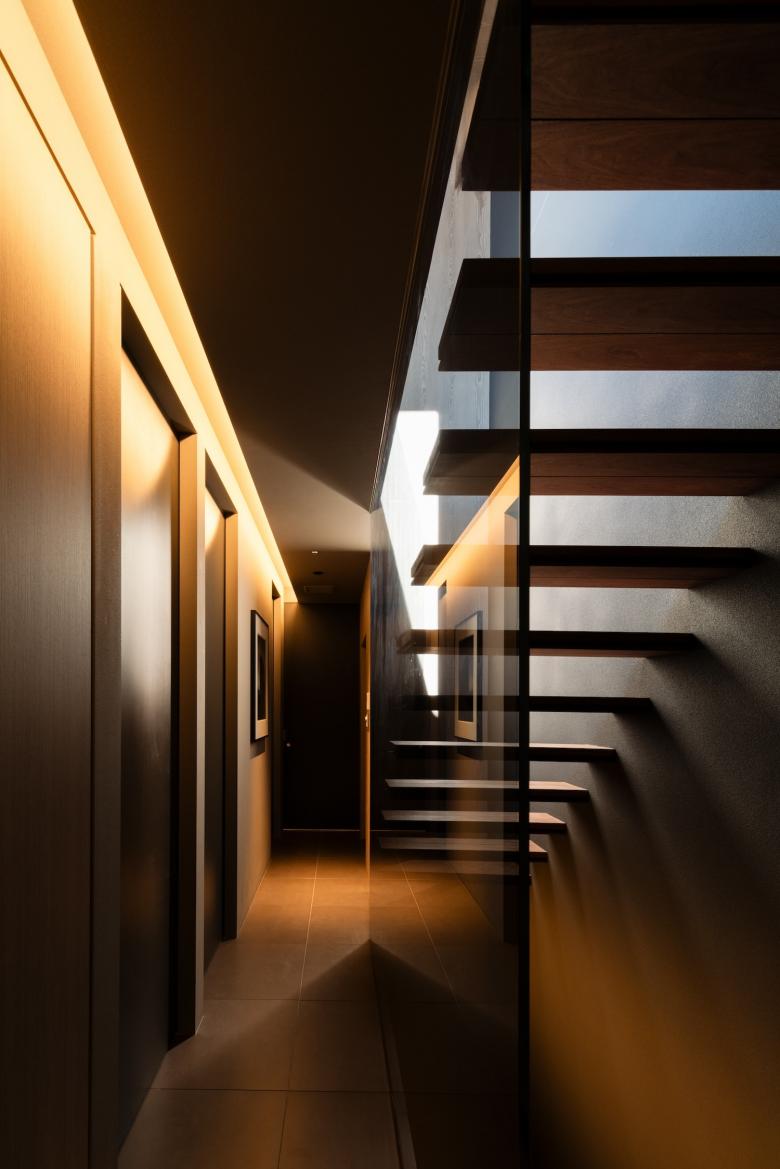 また、桁側壁面を利用してリビング収納やキッチン、トイレ、エレベーターなどを格納。その上部耐風梁に設置したコーブ照明の効果により天井が美しくライトアップされ、昼とは異なる表情がうまれている。