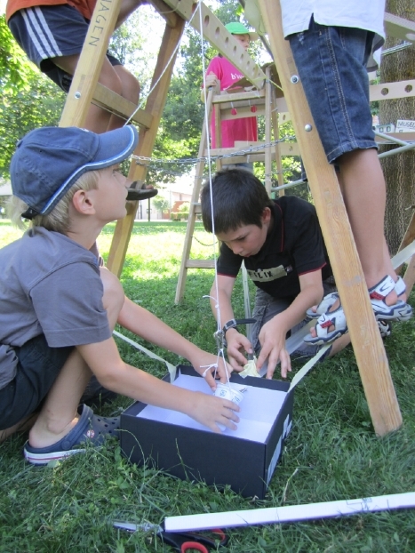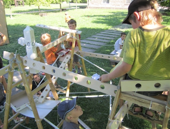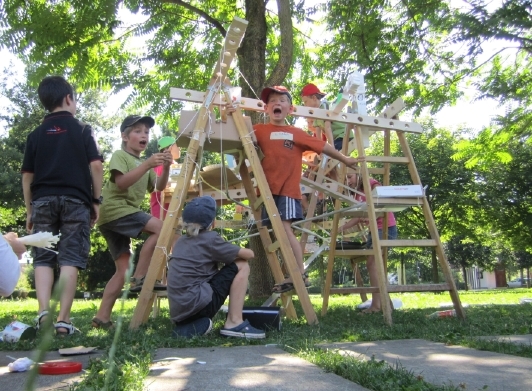 Wir tauchen gemeinsam mit 20 Kindern ein in eine neue Welt, in einen neuen Maßstab, in dem alles möglich ist und wird. Wir bauen nicht nur ein Baumhaus, sondern wir bauen sogar eine ganze Baumstadt. Wir bauen zuerst eine Grundstruktur aus Leitern und Holzlatten im Schatten eines Baumes. In dieser Grundstruktur entstehen auf vielen Ebenen alle von den Kindern erdachten und gewünschten Teile einer Stadt. Verbunden wird alles untereinander mit Wegen aus Kugelbahnen, Rohren, Liften und Seilbahnen.
