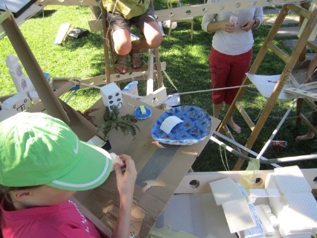 In der Bauabteilung werden mit heißem Draht fleißig Häuser, Schulen, Kino, Spielwarengeschäft, Museen, Skaterplätze, ein Park, Schwimmbäder...modelliert, angemalt und anschließend ein Ort in der begeh- und bekletterbaren Struktur gesucht und platziert.
