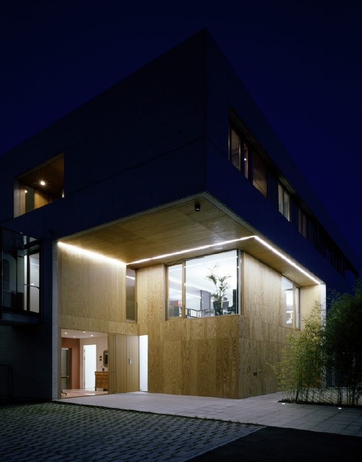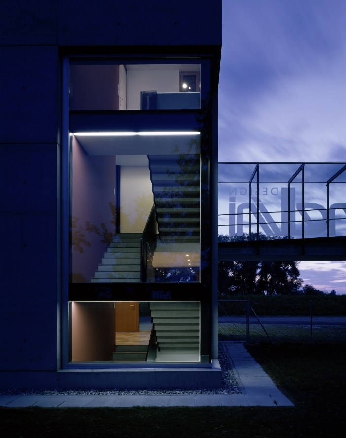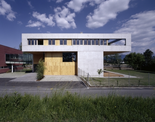 Das Bürowohnhaus auf seiner knappen Parzelle misstraut dem Boden, verlässt sich nicht auf die Schönheit eines Gartens und des kunterbunten Umlandes. Es reagiert darauf mit der Massivität seines Sichtbetonpanzers, der ein warmgetöntes Innenleben birgt, und mit dem Drang nach oben. Das Wohngeschoss hängt sich gewissermaßen an den Himmel. Der Blick auf das Ried und die Berge und den gemächlich dahinfließenden Hardergraben werden zum Blick auf einen visuellen Garten.