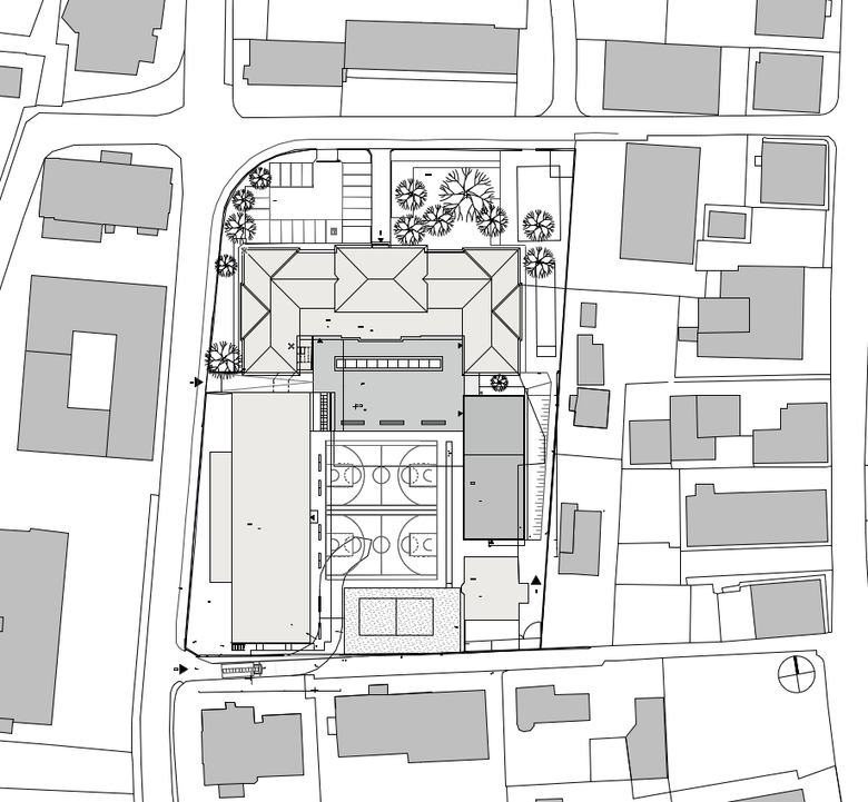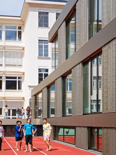 Dem Projekt gelingt es, der schwer zu kompensierenden volumetrischen Dominanz des Altbaus eine eigenständige, jedoch aus den komplexen Sachverhalten der örtlichen Situation, abgeleitete bauplastische Komposition entgegen zu stellen, die „sich selbst erklärend“ eben den Bestand ergänzt, weiterführt, und sich in die Maßstäblichkeit der Umgebung angemessen einfügt. Hofseitig ist der Turnsaal dem Bestandsobjekt vorgelegt, und soweit abgesenkt, dass auf dessen Eindeckung der Erdgeschosszone des Altbaus eine grosszügige Terrasse als Pausen- und Sportfläche vorgelagert wird.