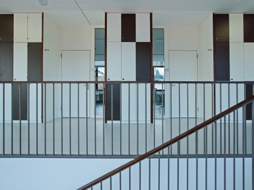 Der besondere Mehrwert dieses räumlich plastisch gedachten Entwurfes besteht in zahlreichen Bezügen, sowohl intern, wie auch in solchen zum Außenraum. Die Kaskadentreppe des Neubauteiles verknüpft die terrassiert gestaffelten Ebenen bis hin zum tiefgelegten Turnsaal. Seitlich dieser Erschließungswege öffnen sich reizvolle Blicke in einen kleinen Vorgartenhof, unmittelbar gegenüber in den Turnsaal.