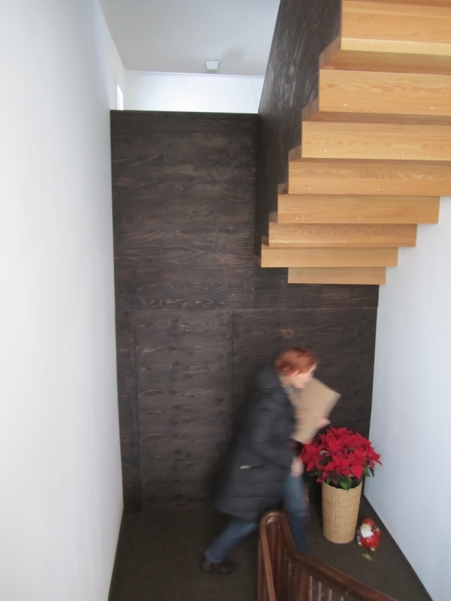 Das 1. Obergeschoß ist das Wohngeschoß der Familie, ein großzügiger offener Wohn-Essbereich mit direkt vorgelagerter, gedeckter Terrasse nach Süden ermöglicht ein offenes Wohnen von innen nach außen. Die vertikale Erschließung wurde ab dem ersten Zwischenpodest neu konzipiert und die neue Stiege wurde wie eine Skulptur dem Haus eingefügt.