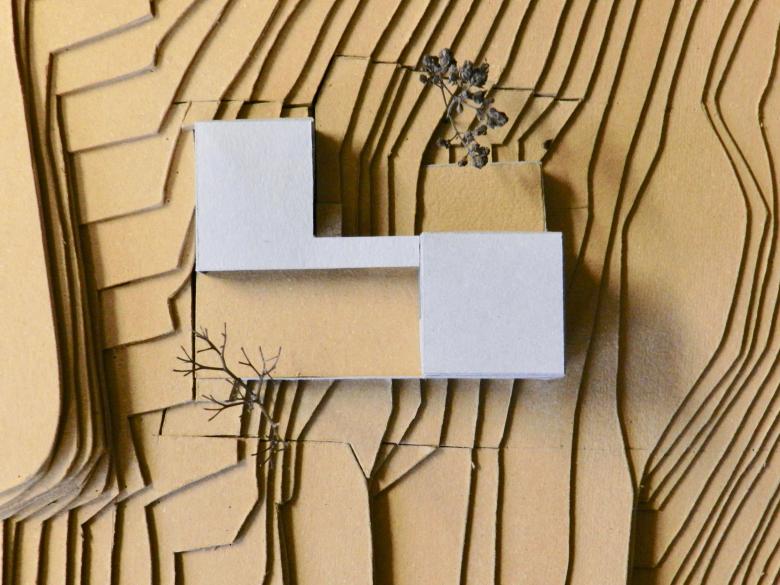 Das Wohngebäude wird auf der obersten Ebene ±0 über den Eingangshof betreten. Dieses Geschoß ist als Ein-liegerwohnung konzipiert. Die Wohnebene -1 bildet das mittlere Geschoß, das eine große Terrasse als Außenbereich zugeordnet hat. Im untersten Geschoß sind auf der Ebene -2 vier Schlafzimmer und zwei Badezimmer untergebracht. Dieses Geschoß ist als Hanggeschoß leicht eingegraben.