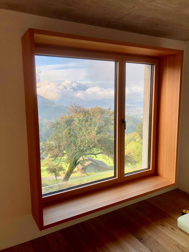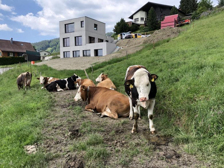Das Einfamilienhaus besteht aus einem dreigeschossigen quadratischen Baukörper mit 7,17m Seitenlänge und einer freistehenden Doppelgarage. Durch die Grundrissanordnung bilden diese beiden Baukörper auf dem Hanggrundstück einen ebenen Vorplatz / Eingangshof. Alle Baukörper und Fassaden sind in Sichtbeton, Fensterrahmen aus Lärchenholz.