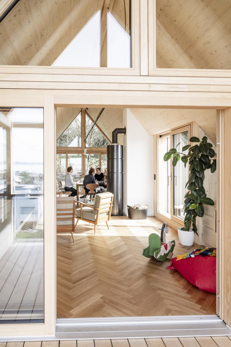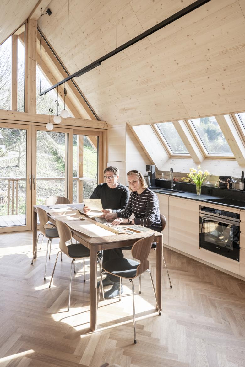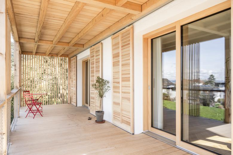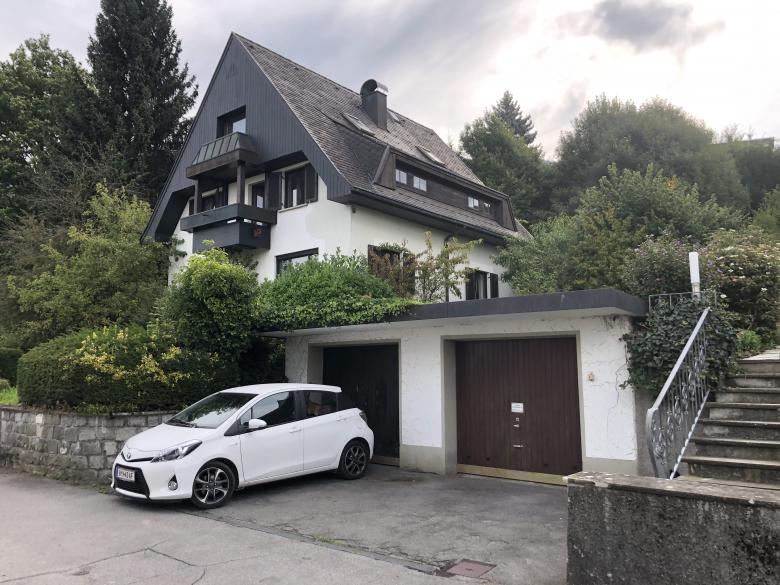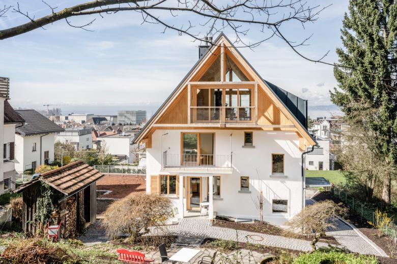Die Struktur wurde dahingehend abgeändert, dass jetzt im Erdgeschoss eine barrierefrei erreichbare Einliegerwohnung von den beiden Obergeschossen abgetrennt werden kann. Diese Einheit kann als Praxis, als Gästewohnung, als Altenwohnung genutzt oder leicht in den Gesamtverband des Hauses integriert werden. Im 1.OG befinden sich die Schlafzimmer und Bäder. Das 2.OG ist mit Koch-Wohn-Essraum die Beletage des Hauses. Drei Außenräume in Form von Ost-, Süd-, und Westterrasse ergänzen den Wohnraum mit Ausblicken auf Berg, See und Stadt sowie je nach Jahreszeit, um Sonnen- oder Schattenplätze. An der seeseitigen Giebelseite wurde das Haus über drei Geschossen um Aussenräume in Form von Veranden und Terrassen erweitert. Im EG verschneidet sich diese Terrasse mit Gelände und Garten. An der Bergseite des Hauses wurde die Terrasse und ein Sitzplatz aus den 70-er Jahre erhalten und ein serpentinenartiger Weg zur leichteren Nutzung des Gartens angelegt.