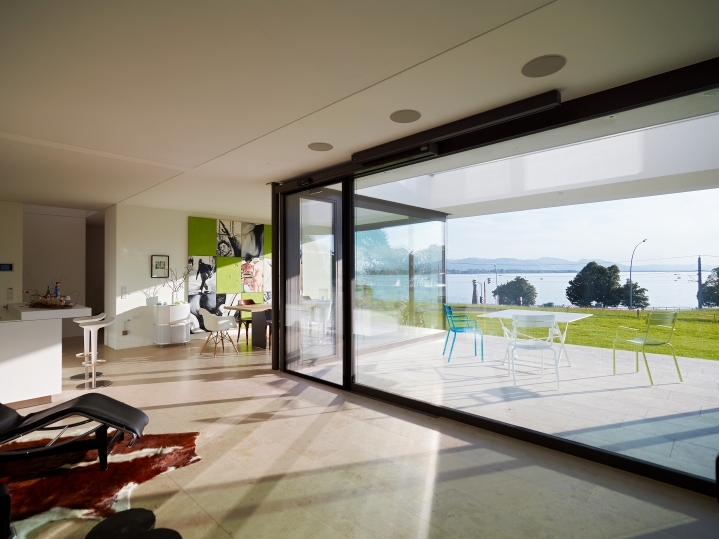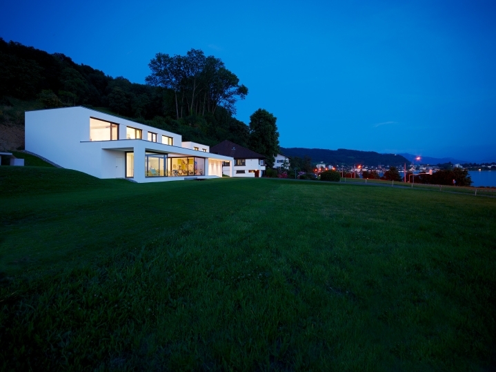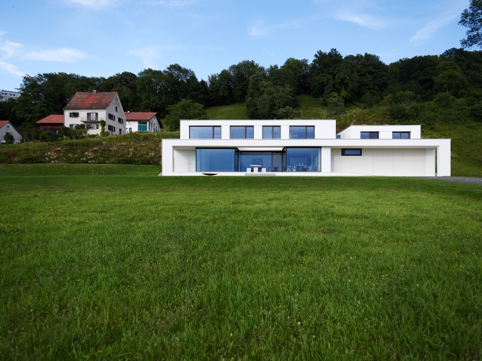 Ein längsgerichteter Baukörper wird parallel zu den Höhenschichtlinien in den Hang gesetzt und orientiert sich mit seiner Hauptfront nach Westen zum Bodensee. Das Obergeschoß ist zurückversetzt. Der zweigeschossige Baukörper treppt sich somit parallel zum Hang ab.