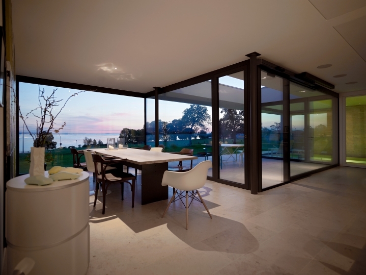 Die Zufahrt erfolgt über den bestehenden Weg an der Südseite des Grundstücks. Am Ende der Zufahrt ist eine Garage im Baukörper situiert. Über eine gedeckte Rampe wird das Erdgeschoß erschlossen. Im Erdgeschoss sind um einen Hof Küche, Ess- und Wohnraum, Schwimmbad und Sauna situiert. Den gesamten Baukörper in seiner Hauptorientierung umfasst ein weit gespanntes Band mit einer Terrasse, Innenraum und Außenraum gehen ineinander über. Raumhohe Glaselemente formen ein Tageslicht durchflutetes, möglichst transparentes Raumkontinuum.