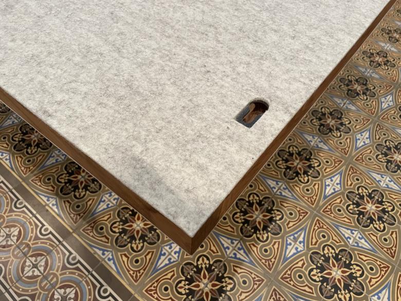 Es war uns als Architekten und Gestalter sehr wichtig, für die eingesetzten Materialien Naturprodukte zu verwenden. Rahmen aus massivem Eichenholz wurden mit schwerer Mineralwolle gefüllt, mit einer Lochplatte und mit einer Filzplatte abgedeckt. Dieser Filz auf Absorber, Bänken und Stühlen wurde zu 100% aus Schafwolle hergestellt und strahlt durch die zurückhaltende Farbgebung