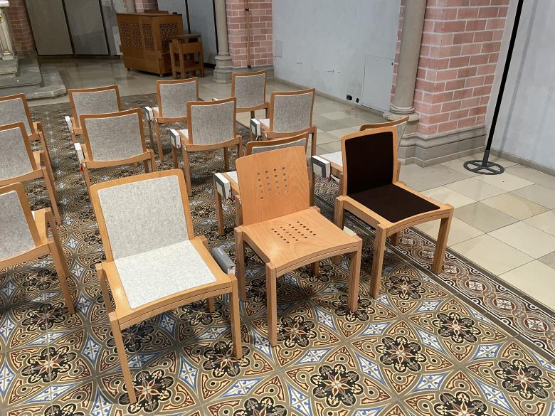 auch die Ruhe einer Schafherde aus. Der für die Farbentscheidung gefertigte Musterstuhl mit der dunklen Alternativfarbe reiht sich jetzt als schwarzes Schaf friedlich in die Herde der 130 Stühle ein und dokumentiert damit auch einen Entscheidungsprozess, der im Gremium gemeinsam mit Vertreteri*nnen von Pfarre, Denkmalamt und Diözese getroffen wurde. Ein unveränderter Stuhl