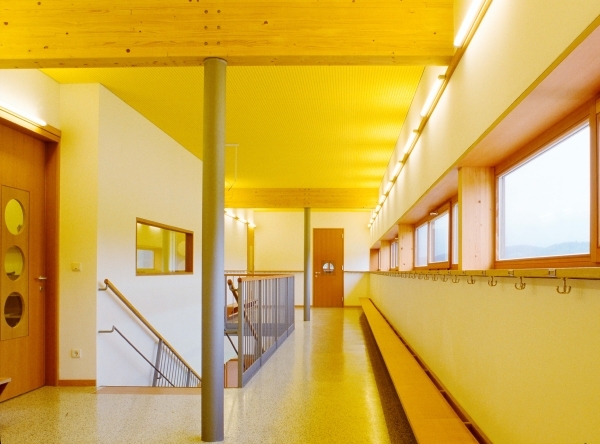 Unten folgt das grundrissliche Konzept den komplexeren Bedürfnissen einer altersgemischten Ganztagsgruppe, schließt der in der Mitte liegende Gruppenraum nach Westen mit dem Küchen-Ess-Terrassenbereich und hangseitig mit Ruheräumen ab. Im Obergeschoß bilden die Nebenräume die Mitte und werden spiegelgleich von den beiden Gruppenräumen des Regelkindergartens flankiert.