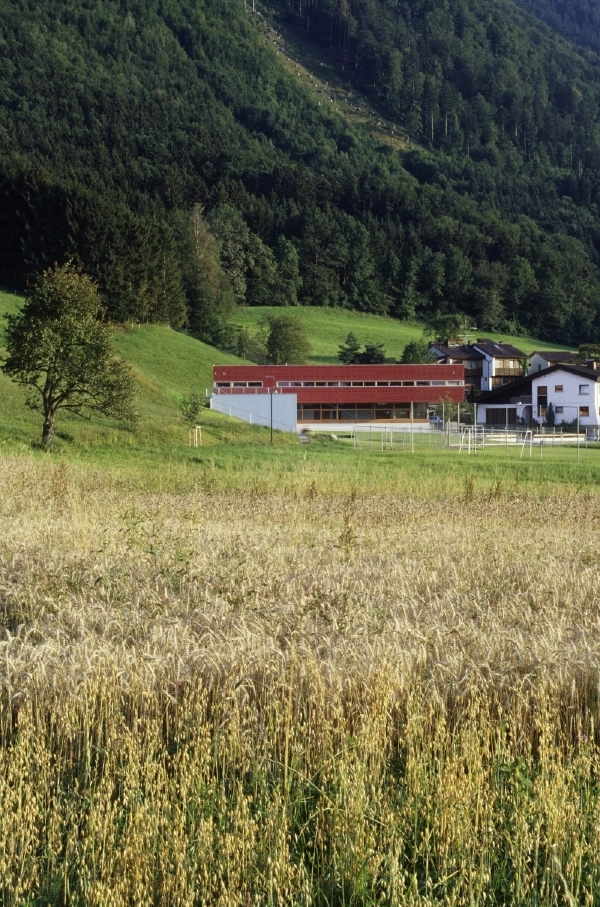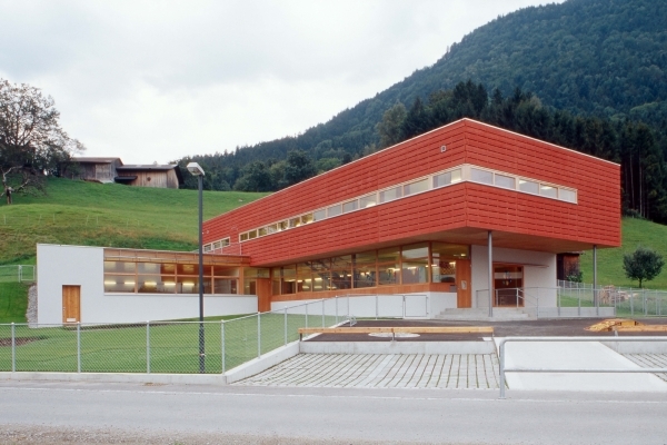 Das massive Hineindrängen der Baukörper in den Hang gleicht das Defizit an ebenen Flächen im Grundstück aus und schafft Platz für die Freibereiche – einen öffentlich zugänglichen Spielplatz vor dem auch extern genutzten Seitentrakt, einen privaten Spielhof für den Kindergarten im südseitigen Gelände und einen asphaltierten Vorplatz mit Skaterrampen und Sitzbänken, die eine Barriere zum tieferliegenden Parkplatz bilden.