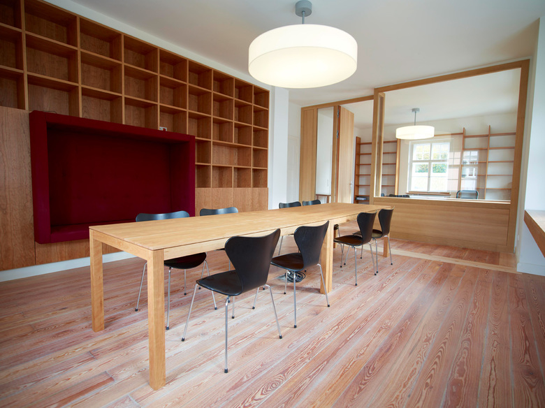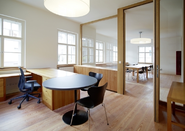 Die Verwaltungsebene im Erdgeschoß wurde von den Wohneinheiten darüber getrennt. Gartenseitig erschließt ein neuer, vom Pfarrbüro unabhängiger Eingang, die Wohnungen. Der Zugang zum Pfarrbüro befindet sich weiterhin kirchenseitig. Das EG wurde neu eingeteilt um die Verwaltungsräume der Pfarre auf 117m2 zu optimieren. Neben den Räumen für Pfarrbüro, Büro für Pfarrer, Arbeitsplätze für Buchhaltung, Pastoralassistentin und Zivildiener und Küche wird der neue Besprechungs- und Gemeinschaftsraum eine zentrale Rolle als Denkfabrik für die Ausschüsse und Räte der Pfarre einnehmen, sol abr auch für einen gemütlichen Hock dei entsprechende Atmosphäre bieten. Eine große Bücherwand birgt die Bibliothek der Pfarre, eine ausgepolsterte Sitznische darin bietet Möglichkeit der Kontemplation.