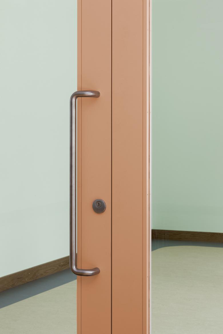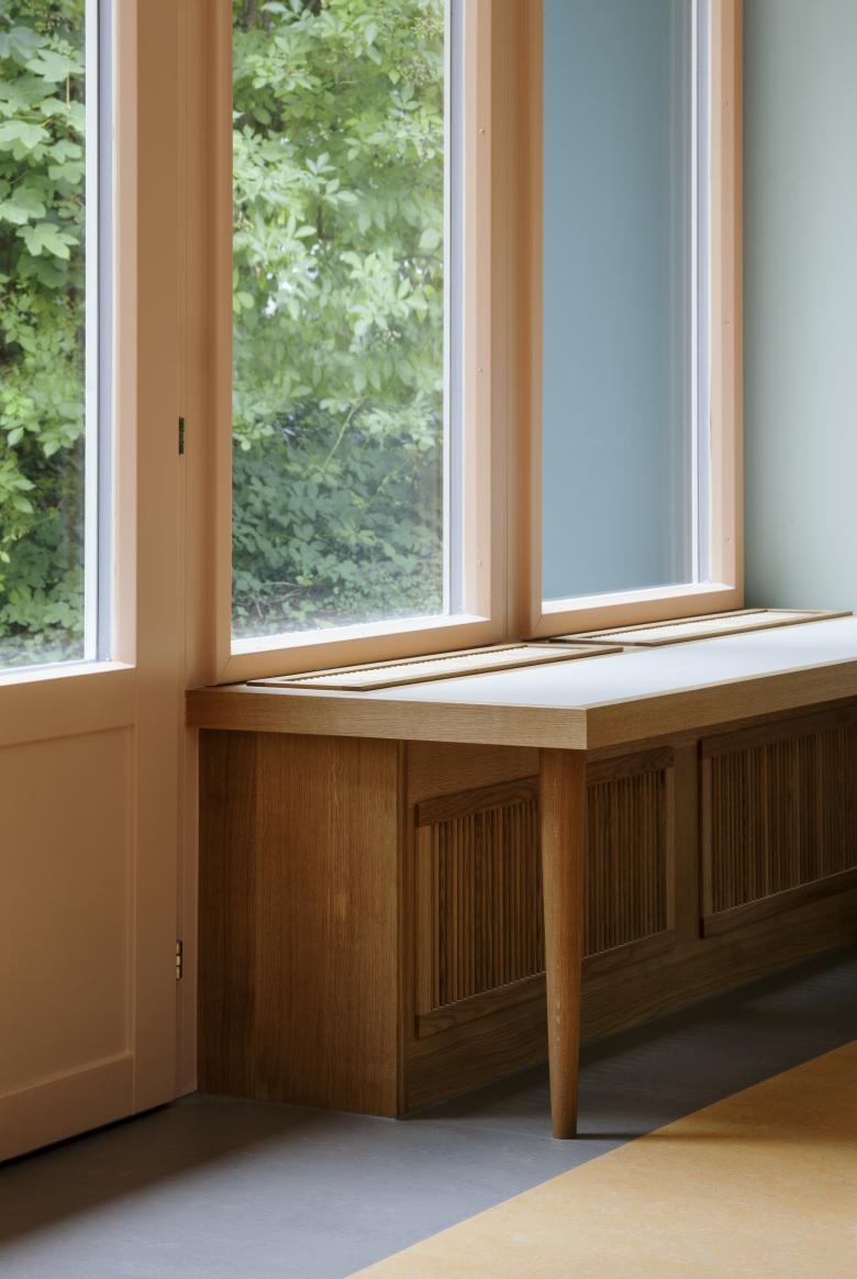 In einer Machbarkeitsstudie wurde durch die Architekten aufgezeigt, wie ein Kindergarten unter dem vorgegebenen Betriebskonzept im geforderten Termin- und Kostenrahmen umgesetzt werden kann. Der neue städtische Kindergarten nimmt den starken Bezug zum Aussenraum und die südwest Ausrichtung des Pavillon auf. Der Kindergarten wie auch der Gruppenraum profitieren von der raumhohen Fensterfront zum Garten und Aussensitzplatz. Die Front wurde mit einem durchgängigen Spiel- und Arbeitssims ergänzt. Holztüren mit grossflächigen Verglasungen und ein Innenfenster erlauben die gewünschten inneren Sichtbezüge. Der bestehende strassenseitige Eingang wurde zu Gunsten einer dritten WC-Einheit aufgehoben und auf die überdachte Zugangsseite verlegt. Der Innenausbau wird geprägt von der zurückhaltenden Mehrfarbigkeit, den tapezierten und gestrichenen Wänden und den neuen Böden in farbigem Linoleum. Die in Eiche und Lino materialisierten Einbaumöbel in Eingang, Kindergarten und Gruppenraum werden als Garderobe, Spiel- und Arbeitssims genutzt und sind eine ästhetisch hochwertige Verkleidung der Heizkörper. Die technische Ausstattung wurde komplett rückgebaut und mit Neuinstallationen auf den neuesten Stand gebracht.