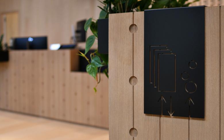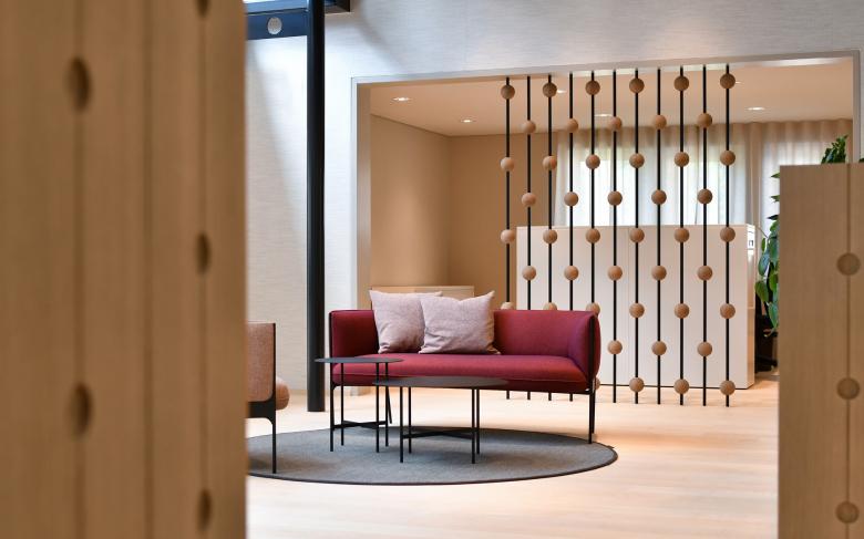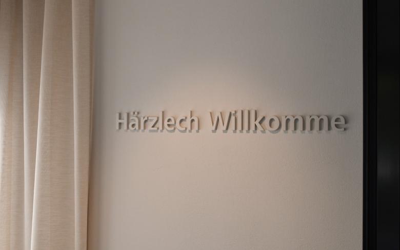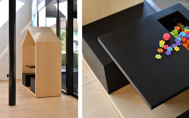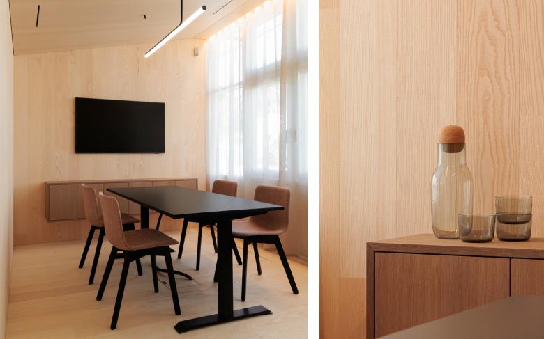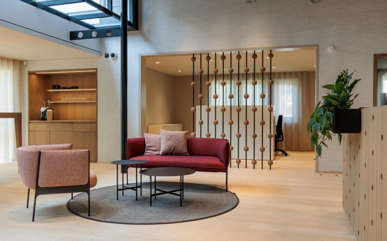 Durch die Raumeinteilung und den Holzkubus, der an ein stilisiertes Holzhaus erinnert, entsteht eine aufgeräumte und warme Stimmung. Der Empfangskorpus zeigt eine besondere Oberfläche - seine Ornamentik ist eine moderne Interpretation der Balkongeländer aus dem Emmental. Im Zentrum befindet sich eine Insel mit schlichten Polstermöbeln, die zum Warten einladen. Ein Raumteiler dahinter schafft eine halboffene Grenze zu den Arbeitsplätzen. Dieser greift die Ornamentik des Empfangs invertiert auf und erinnert an einen Zählrahmen. Der Einsatz von hellem Eschen- und dunklerem Eichenholz schafft ein natürliches Gesamtbild. Die dunkle Decke bringt Ruhe und lässt die bestehenden Träger in den Hintergrund treten. Deren From wird dennoch in der Dachschräge des Holzkubus aufgenommen. Die neuen Raumeinteilungen entstehen durch minimale Eingriffe in den Bestand, welche Nutzung und architektonischen Eindruck deutlich verbessern. Die zeitlose Gestaltung, die das Umfeld auf moderne Weise spiegelt, trägt zu einem nachhaltigen Umbau bei.