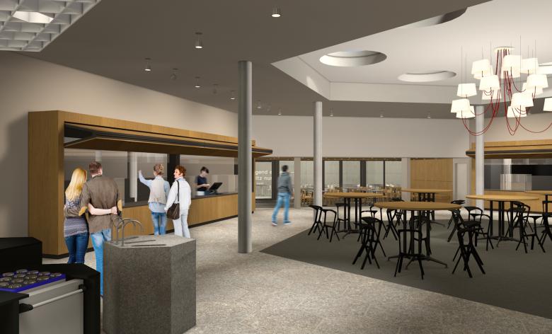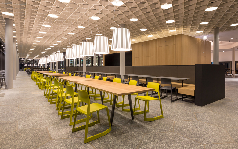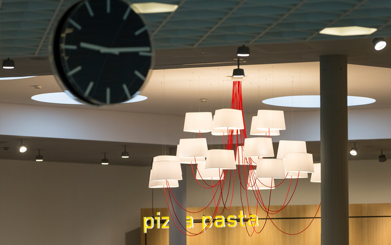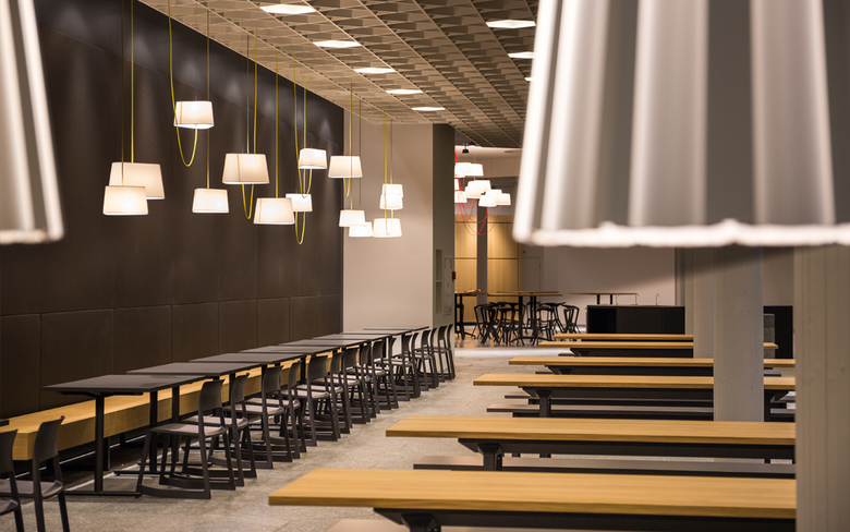 Wie um einen Marktplatz gliedern sich die drei Essens-Counter des food market an der ETH Zürich auf dem Campus Hönggerberg. Und wie Marktstände werden sie bei Betrieb geöffnet und zeigen sich im geschlossenen Zustand als schlichte Holzkuben. Der Platz, der in der Mitte entsteht, ist Begegnungsfläche und Imbiss-Bereich zugleich. Das abwechslungsreiche Mobiliar bietet mit verschiedenen Stühlen, Barhockern und Bänken unterschiedlichste Sitzformen und gliedert somit den Raum. Auch die Beleuchtung, die aus einer Kombination von auffälligen Pendelleuchten und funktionalen Leuchten besteht, sorgt für die Akzentuierung der verschiedenen Bereiche und lässt trotz der Grösse des food market eine behagliche Atmosphäre entstehen. Beim Umbau wurden denkmalgeschützte Elemente, wie das prägnante Deckenraster, erneuert und in die neue Gestaltung integriert.