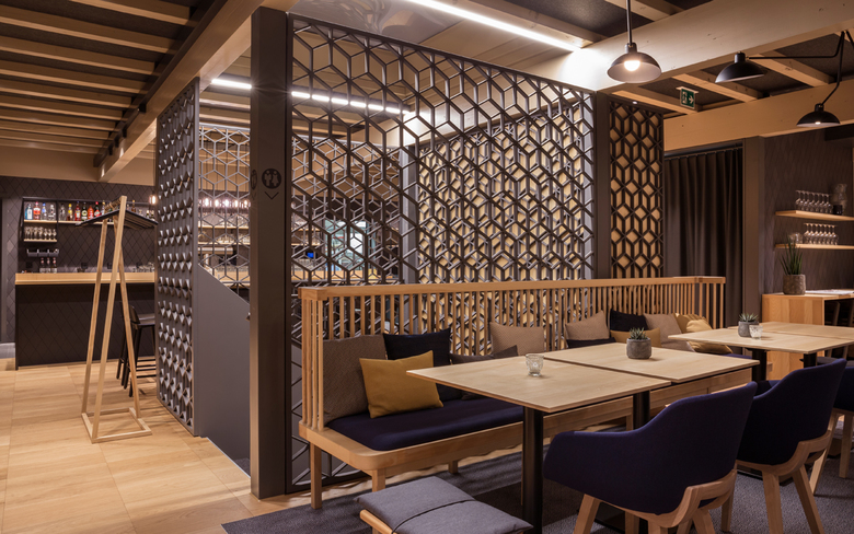 Das zur Tennishalle angrenzende Restaurant erstrahlt seit dem 15. Dezember 2018 in neuem Glanz und lädt auf 180m2 nicht nur nach dem Sport zum Essen und Verweilen ein. Der Entwurf im nordischen Stil hebt das bestehende Gebäude in Holzbauweise hervor und bietet 104 Sitzplätze. Der Bestand wurde grosszügig geöffnet und mit einem Teppich als Bodenwechsel eine Insel um die tragende Wandscheibe geschaffen. Die Rautenform wurde als gestalterische Neuinterpretation des Geflechts eines Tennisschlägers mittels hochwertigen Wandfliesen integriert. Die vertikale Erschliessung - der Treppenkern - wird mit einem perforierten Raumtrenner aus Rauten betont und so zum Blickfang. Die Raff-Vorhänge an den Fenstern in Richtung Tennishalle bieten die Möglichkeit die warme Lichtstimmung trotz ausgeleuchteter Sporthalle am Abend zu bewahren. Die Material- und Farbkombination aus Eichen- und Eschenholz, Messing, Anthrazit, Saphirblau und Honiggelb verleihen dem Raum in Kombination mit den geometrischen Formen eine spannende Atmosphäre, welche durch die warme Lichtstimmung verstärkt wird. Mit den unterschiedlich generierten Sitzgelegenheiten und den diversen saisonalen gutbürgerlichen Spezialitäten bietet das Restaurant Schlossfeld für jeden das passende Angebot.