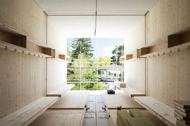 Die insgesamt 128 Holzmodule sind so konzipiert, dass eine maximale Vorfertigung möglich war und dass sie später einfach versetzt werden können. Ein besonderes Augenmerk galt der Vereinfachung der Haustechnik im Sinne von Lowtec. Weil die Korridore als horizontale Lüftungskanäle dienen, fielen die gesamten Rohrleitungen samt Schnittstellen weg. Zudem wurden die Verbundlüfter-Elemente und die Fassaden-Klimageräte für Heizung sowie Kühlung bereits im Werk eingebaut. Ergänzt wird das nachhaltige Haustechnikkonzept durch Wärmepumpen und eine Fotovoltaikanlage.