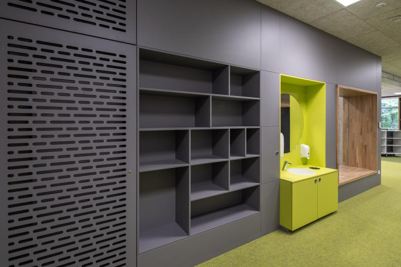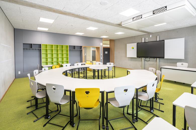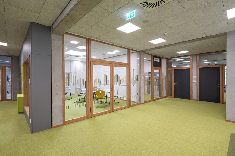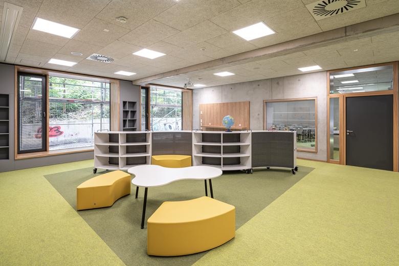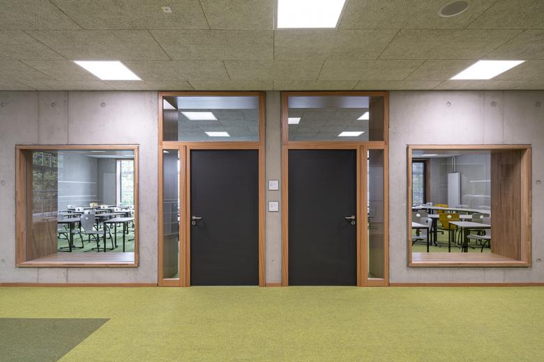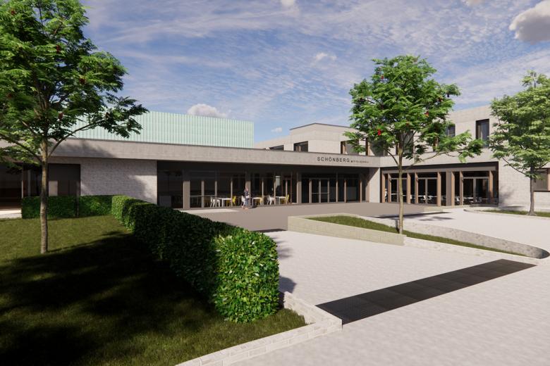 Die Schönberg-Mittelschule liegt im Aschaffenburger Stadtteil Damm und wird als offene Ganztagsschule geführt. Zum Schulgebäude aus den 70er Jahren gehören eine Schwimm- und Sporthalle sowie eine Mensa. Neben dem hohen Sanierungsbedarf sind sowohl die barrierefreie Erschließung als auch die Kompensation eines Fehlbedarfs an allgemeinen und Fach-Unterrichtsräumen Bestandteil der Planungsaufgabe. Zudem ermöglicht die Schule nicht die Umsetzung des pädagogischen Konzeptes der Schule. Die Erweiterung um zusätzliche Unterrichtsbereiche ist aufgrund der Grundstück-Struktur und Positionierung der Schule nur an der östlichen Schulseite möglich. Der westliche Bauteil wird über die Mitte des Erschließungsbauteils gespiegelt und an den zweiten vorhandenen Erschließungskern angeschlossen. Der nun in der Mitte liegende Erschließungsbau behält grundsätzlich seine Struktur, jedoch werden die vorhandenen Lichtöffnungen erweitert, um im Foyer eine bessere Atmosphäre für den Aufenthaltsbereich zu erzeugen. Der 3-geschossige Erweiterungsbau beinhaltet unter anderen 8 Unterrichtsräume. Es entstehen nach Umbau und Erweiterung des Schulgebäudes insgesamt 4 Lern-Cluster mit jeweils 4 Unterrichtsräumen, die wiederum in Teilen über mobile Trennwände mit den vorgelagerten Foren zu offenen Lernlandschaften zusammengeschlossen werden können. Fachunterrichtsräume befinden sich gebündelt im Talgeschoss, die Verwaltung wird gemeinsamen mit dem Bereich für das pädagogische Personal im Obergeschoss des Mittelgebäudes untergebracht. Die neue Eingangssituation wird zusammen mit einer neuen Mensa und Ergänzungsflächen der Sporthalle vorgelagert. Schul- und Sportgebäude erhalten jeweils einen neuen Aufzug, unterschiedliche Höhensituationen im Pausenhallen-Bereich werden mittels Rampen barrierefrei erschlossen. Neue Fassaden fassen Bestand und Neubau zusammen und bilden mit der Sporthalle ein gemeinsames Ensemble.