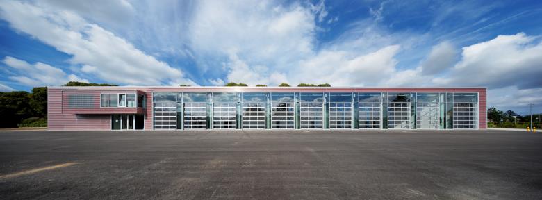 Die großen, gläsernen Tore geben den Blick in die Fahrzeughalle frei und bilden die Schauseite zur Stadt. Die Fassade ist mit einem Aluminium-Lochblech verkleidet, welches die dahinterliegenden Fenster vor Verschmutzung schützt und als Sonnenschutz dient. Einzelne Bereiche werden geöffnet und zeigen die zurückspringende, rote Fassade.