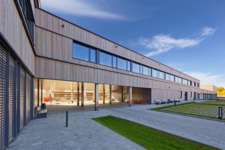 Die Kubatur setzt sich aus drei klaren, geometrischen Baukörpern zusammen. Die Holzfassade mit horizontal durchlaufenden Metallbändern bewirkt eine optische und funktionale Verbindung der einzelnen Bereiche.