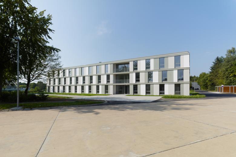 In der transparenten Erschließungszone ist je Geschoss eine Teeküche mit Aufenthaltsraum und Loggia als gemeinschaftliche Kommunikationszone angegliedert. Die Dächer der Gebäude sind als extensiv begrünte Flachdächer ausgeführt. Die Kollektorfläche der solarthermischen Anlage auf dem Dach deckt ca. ein Drittel des gesamten Energieverbrauchs des Gebäudes ab.