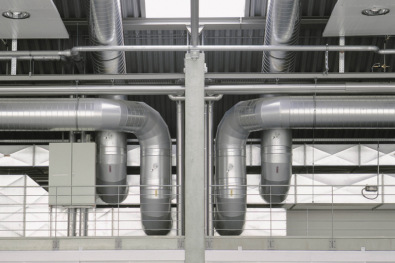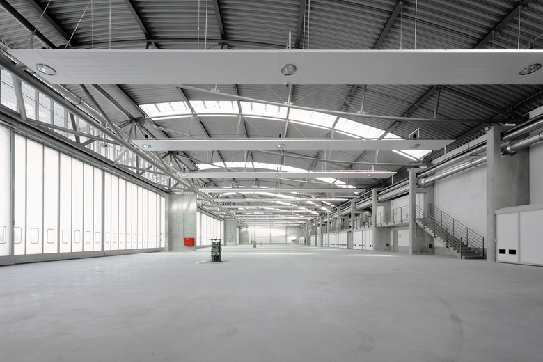 Das Dach ist mit einer auf dem Trapezblech aufliegenden Aluminiumdeckung versehen. In regelmäßigem Abstand sind Oberlichter angeordnet. Darüber hinaus wird die Halle durch die transparente Toranlage und ein darüberliegendes Oberlichtband belichtet, so dass sich ein sehr heller und gleichmäßig ausgeleuchteter Innenraum ergibt.