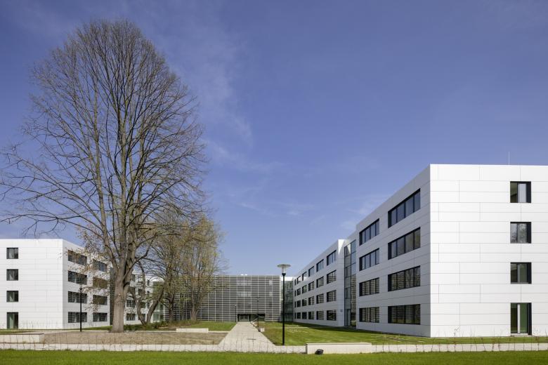 Das Gebäude weist einen U-förmigen Grundriss auf (Zweibund) und gruppiert sich mit Mitteltrakt und Seitenflügeln um einen neuen Hof („Campus“) mit hoher Aufenthaltsqualität.