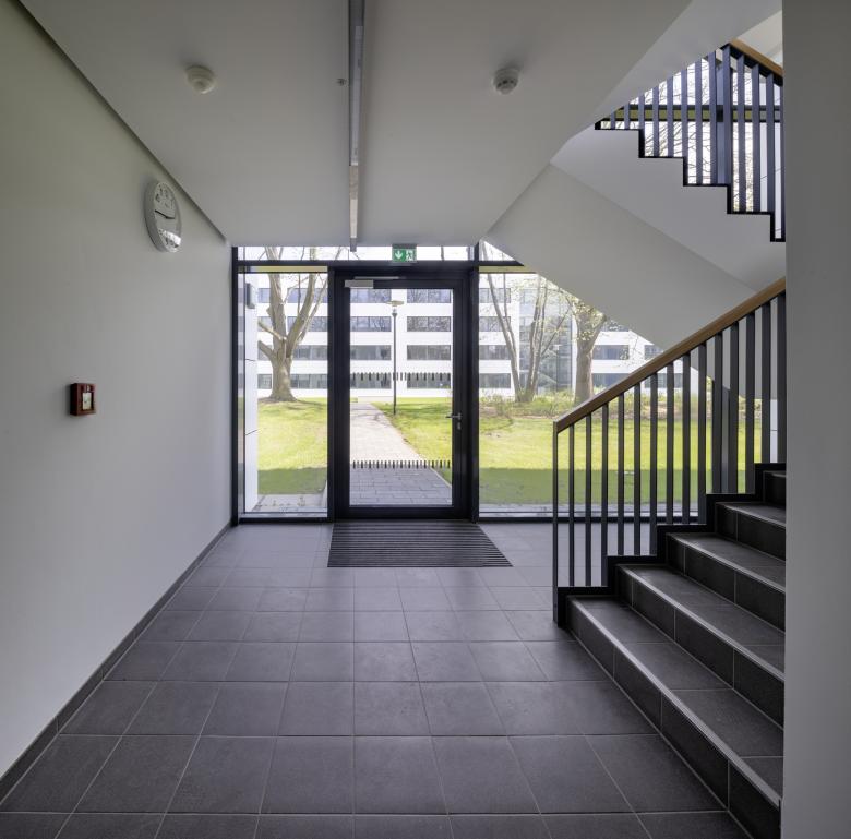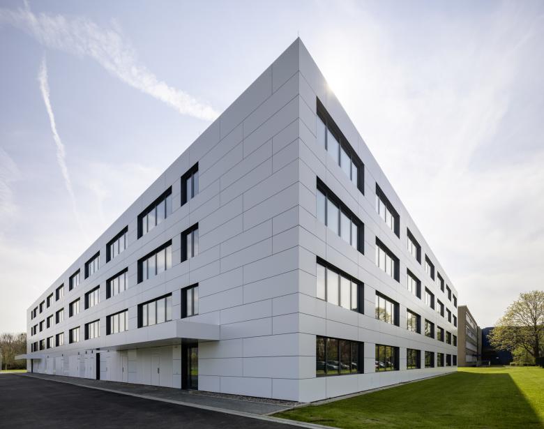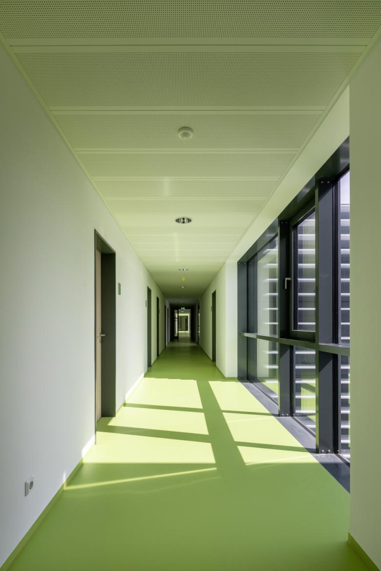 Der horizontale Charakter der Fassade wird durch klar definierte Fenstereinschnitte und liegende Aluminiumpaneele betont, Fluchttreppenhäuser dienen als transparente Zäsuren und lockern die strenge Horizontalität auf.