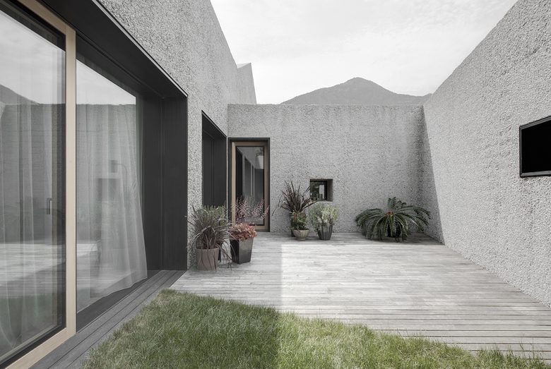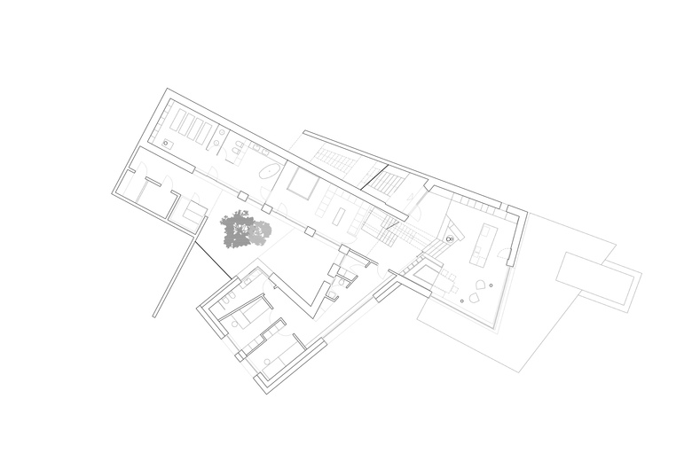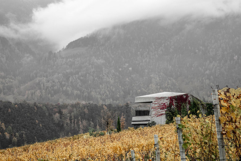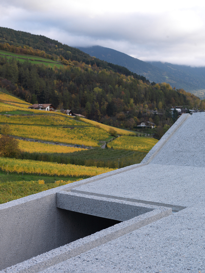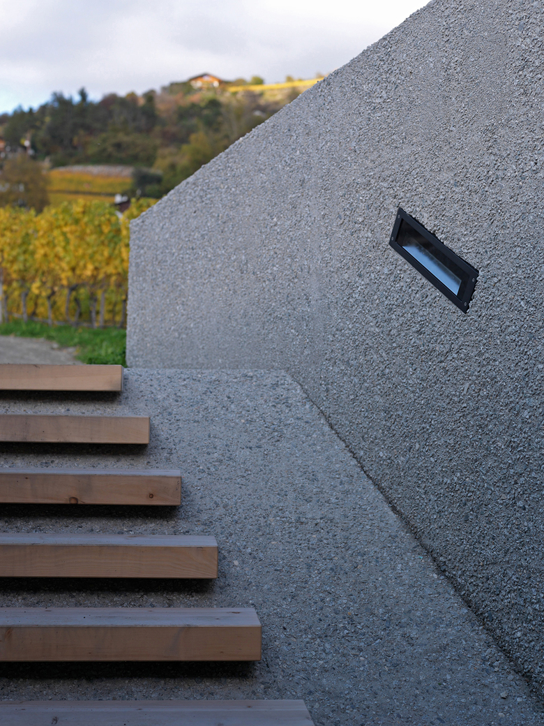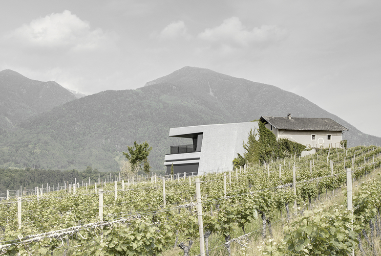 das neue wohnhaus entsteht unmittelbar neben dem elterlichen bauernhaus, auf dem hügel oberhalb des kloster neustifts. ein gebäude, das in seinem ursprung mit der landschaft verwurzelt ist und nach oben wachsend teil der reblandschaft wird. ein langgezogener körper, der sich im geländeverlauf zu einer hofsituation ausweitet. das gebäude wird teil der rebhänge, der landschaft. es entsteht eine neue „mitte“, ein offener, aber intimer bereich, ein innenhof, um den sich der monolith schmiegt. außen der rohe gewaschene beton, innen ein holzbau in sich stehend, der zugleich die konstruktive und statische funktion als dachträger übernimmt. ein weiterführen, ein sich öffnen, ein herauswachsen. ein spiel mit zwischenräumen, mit höhen und ausblicken.