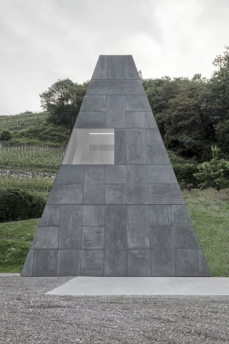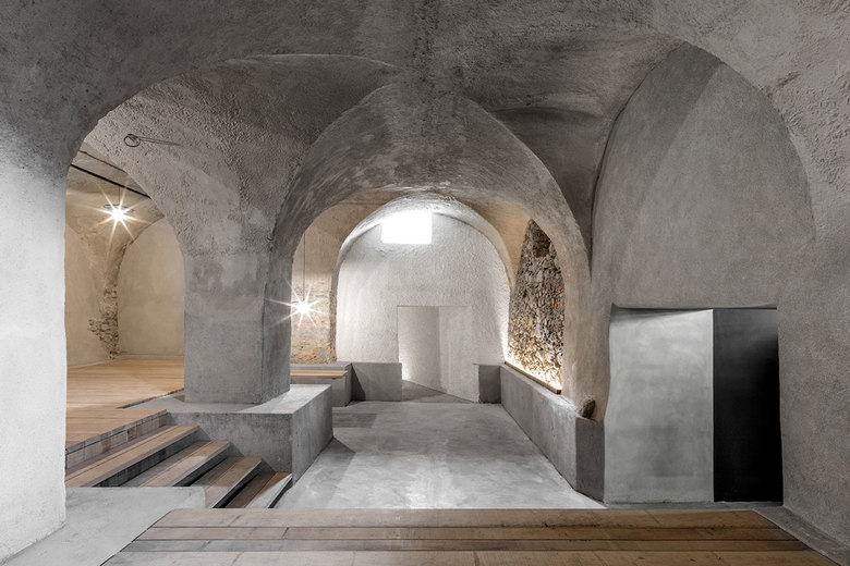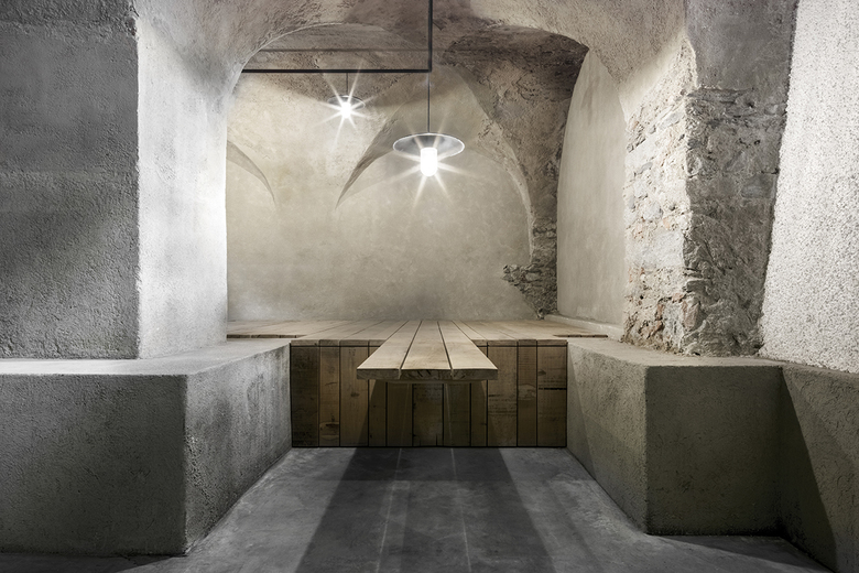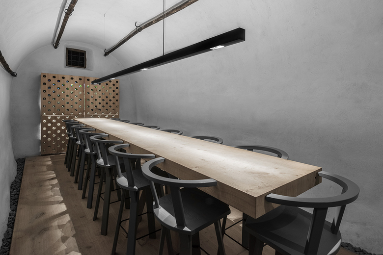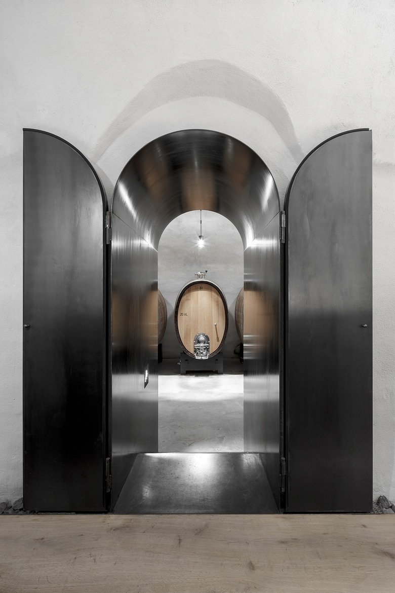 andockend an den bestehenden, historischen säulenkeller aus dem jahre 1450, mit einem treppentunnel verbunden, entsteht in einer art verlängerung der neue trapezförmige keller. die neuen kellerräume dienen der weinproduktion, in der sich die edelstahltanks und die grobe weiße körnung des putzes, von wand und decke, in eine art materialspiel vermischen. eine verfremdung in der reflexion. am ende erwächst aus dem keller ein trichterförmiger, polygonaler turm aus bronze und wird teil der landschaft. er beinhaltet einerseits den technischen ablauf der ernte und andererseits die kommunikationsebene mit blick in die reblandschaft. der historische keller gepaart mit dem neuen ist teil eines parcours, der in die geschichte bzw. der eingang zum keller ist durch eine betonwand gekennzeichnet, die zwei funktionen hat: einerseits dient sie dazu, den besucher zum parkplatz zu leiten, andererseits begleitet sie die rampe, die zum neuen keller führt.in das neue der kellerei pacherhof führt. eine zeitreise in die tradition, sei es beim arbeiten, von eichenfässern bis hin zu edelstahltanks, sei es in der architektur, von gewölben in verbindung mit zeitlosem. ein spiel von natürlichem und künstlichem licht und von materialität.