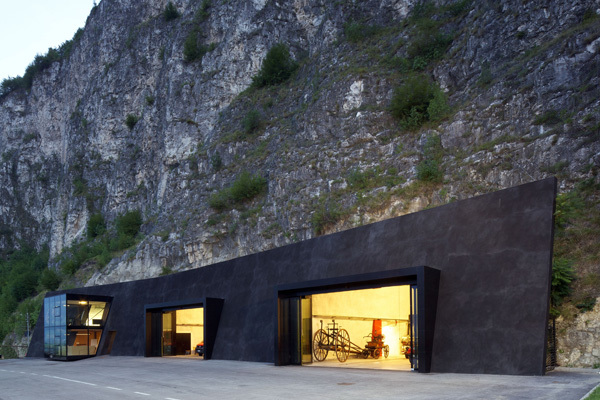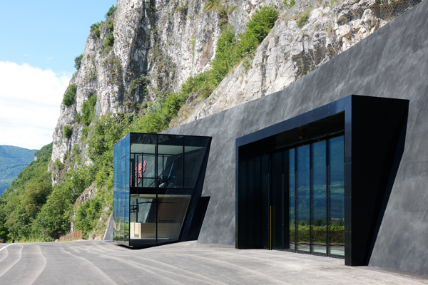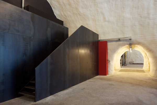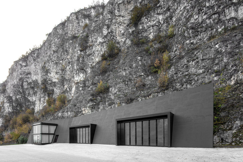 eine felswand wird schauplatz der neuen feuerwehrhalle von margreid an der weinstrasse. drei große kavernen im berg, durch einen querstollen miteinander verbunden, bilden die innenräume der feuerwehrstation. zwei kavernen für die fahrzeuge und eine für die verwaltung. in einem abstand von einem meter wird eine schwarz eingefärbte und geknickte betonwand im neigungswinkel des dahinter stehenden felsens, vor den berg gestellt. die drei kavernenstollen docken unmittelbar hinter der stahlbetonwand an. diese wand dient der absturzsicherung und ist zugleich architektonisches element der feuerwehr. die materialwahl fiel auf beton: beständig, stark und mächtig, der dunkle farbton wurde durch das aufbringen von buchenkohlestaub erreicht und ähnelt verbranntem holz.