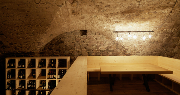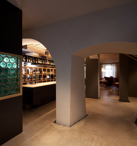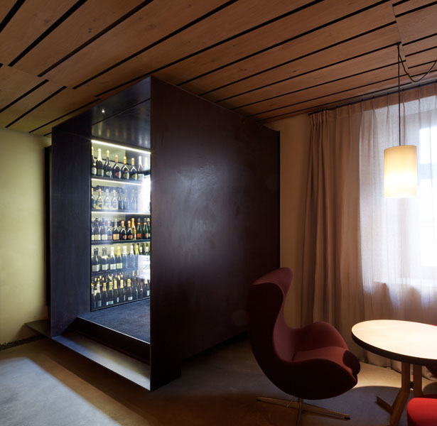 durch einen stahlkubus, nach innen als windfang und weinkühlschrank ausformuliert, betritt man die neu gestalteten innenräume des wirtshauses von 1543. räume und bestand werden so belassen, wie sie sich geben – es entsteht ein raumkonzept, welches das bestehende mit dem neuen in einklang bringt. ein arbeiten mit dem historischen bestand, ein behutsames hineinstellen, ein restaurieren. die räume, ebenen bekommen fast einen dorfcharakter mit plätzen zum verweilen.