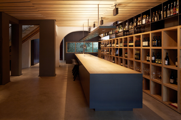 wichtige elemente als „körper im raum“ sind die breite theke, die weinbibliothek, der wc-körper und das backoffice, die als freie elemente in die alten räume gestellt wurden.