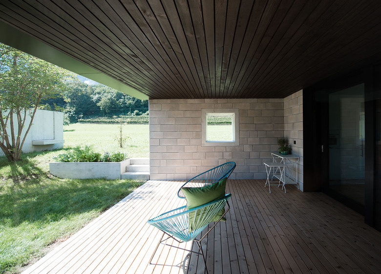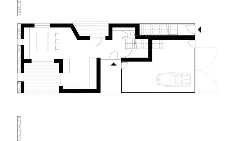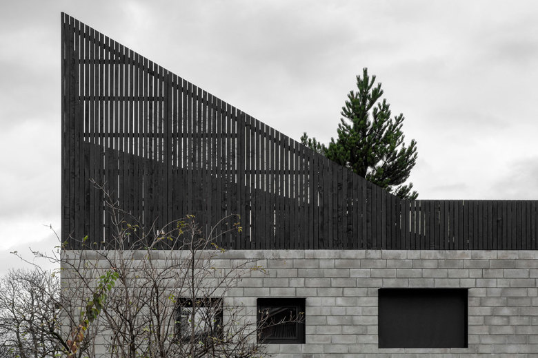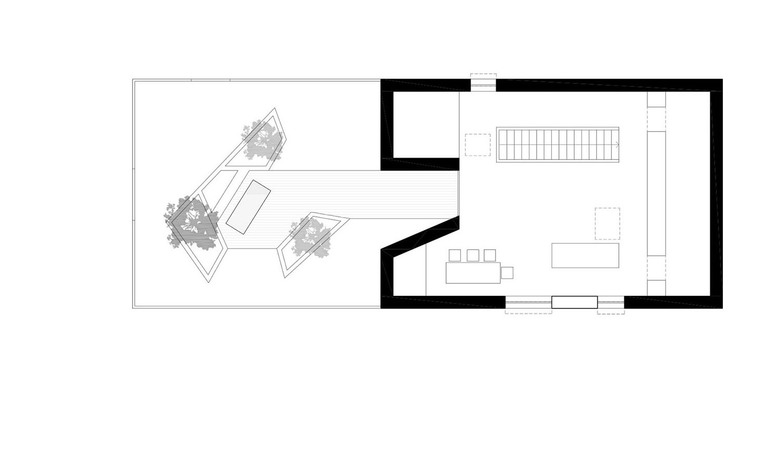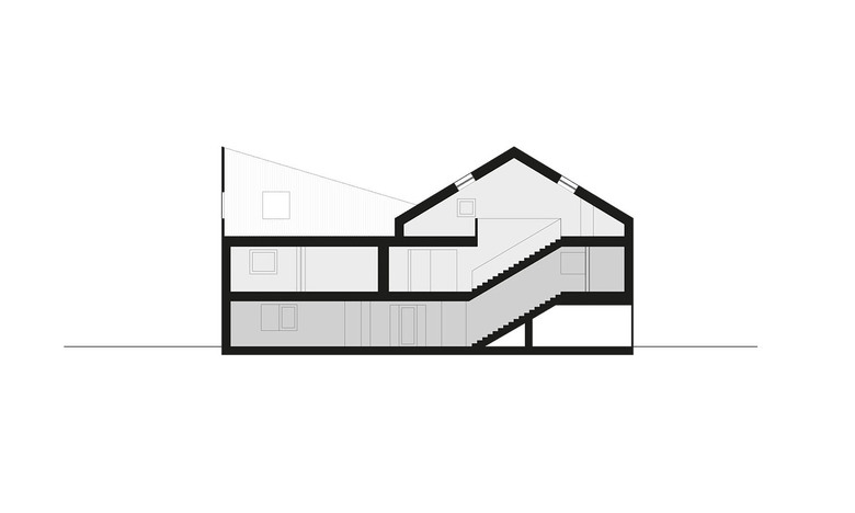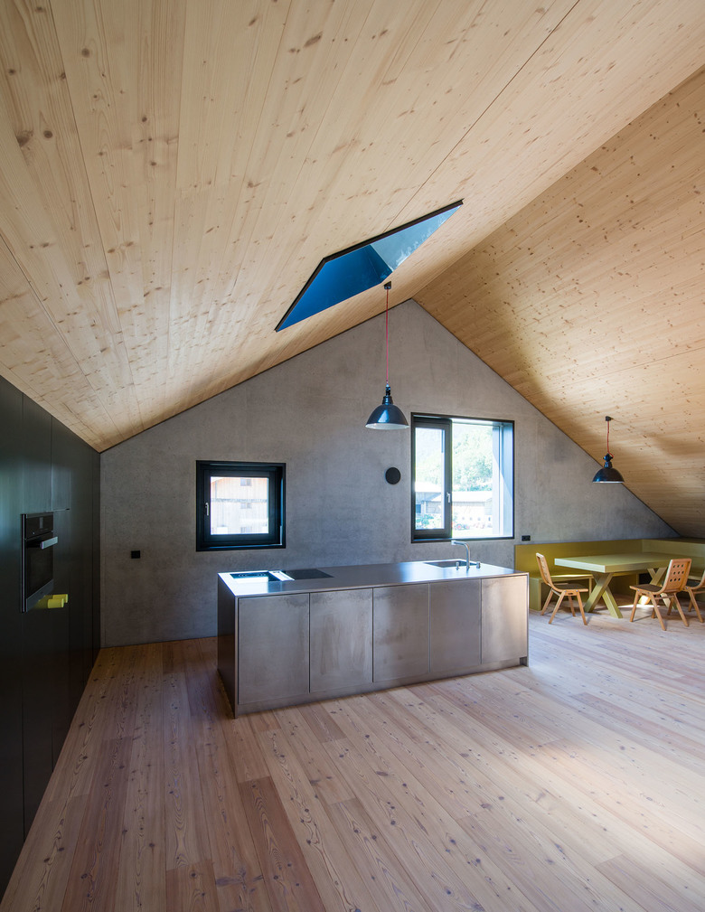 das satteldach, die dachspitze und die überdachung der fenster waren führende themen in der konzeption des entwurfes. die bergspitzen, die die kulisse des gebäudes darstellen, aber auch die traditionellen bauernhöfe, die den charakter der gegend stark prägen, werden auf eine abstrahierte art und weise in der neuen architektur zitiert und neu interpretiert. durch eine parallelverschiebung des grundrisses ermöglicht der entwurf zwei häuser unter einem dach. die für die beiden schwestern unterschiedlich gestalteten wohnungen sind stark darauf ausgelegt den außenraum und die natur nach innen zu holen. die loggien finden tief im gebäude ihren platz, während der dachgarten von dem weitergeführten fassadenband geschützt wird. das zusammenspiel der beiden verwendeten materialien, betonziegel in verbindung mit einer schwarzbraunen holzlattung, verbildlicht die dualität, die im innenraum herrscht.