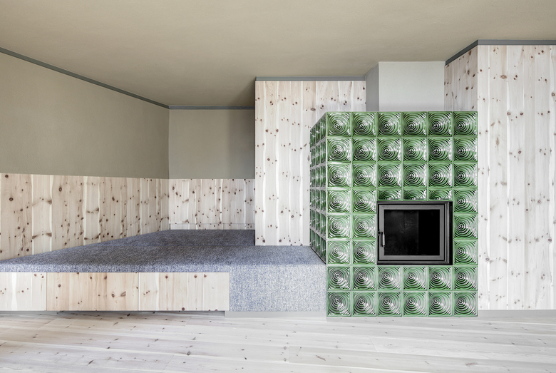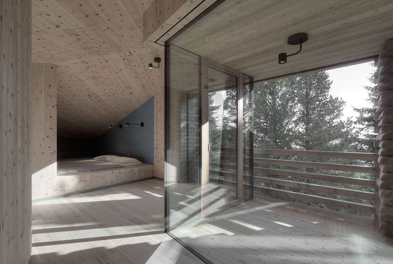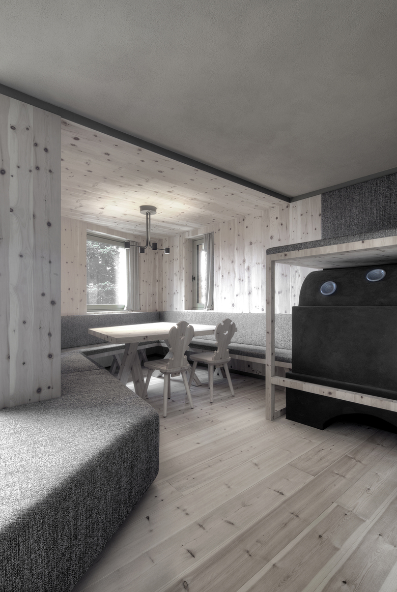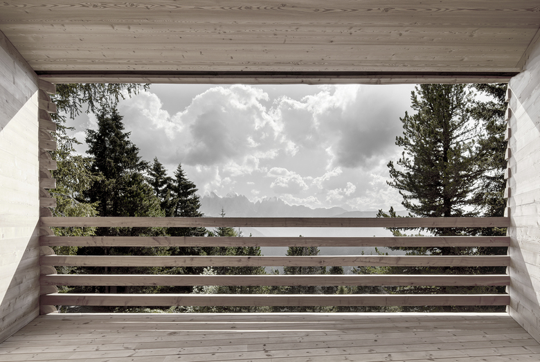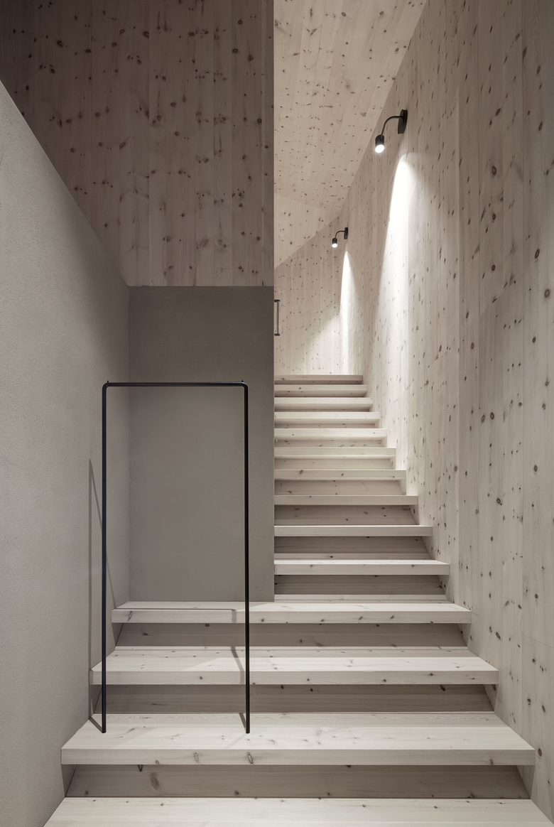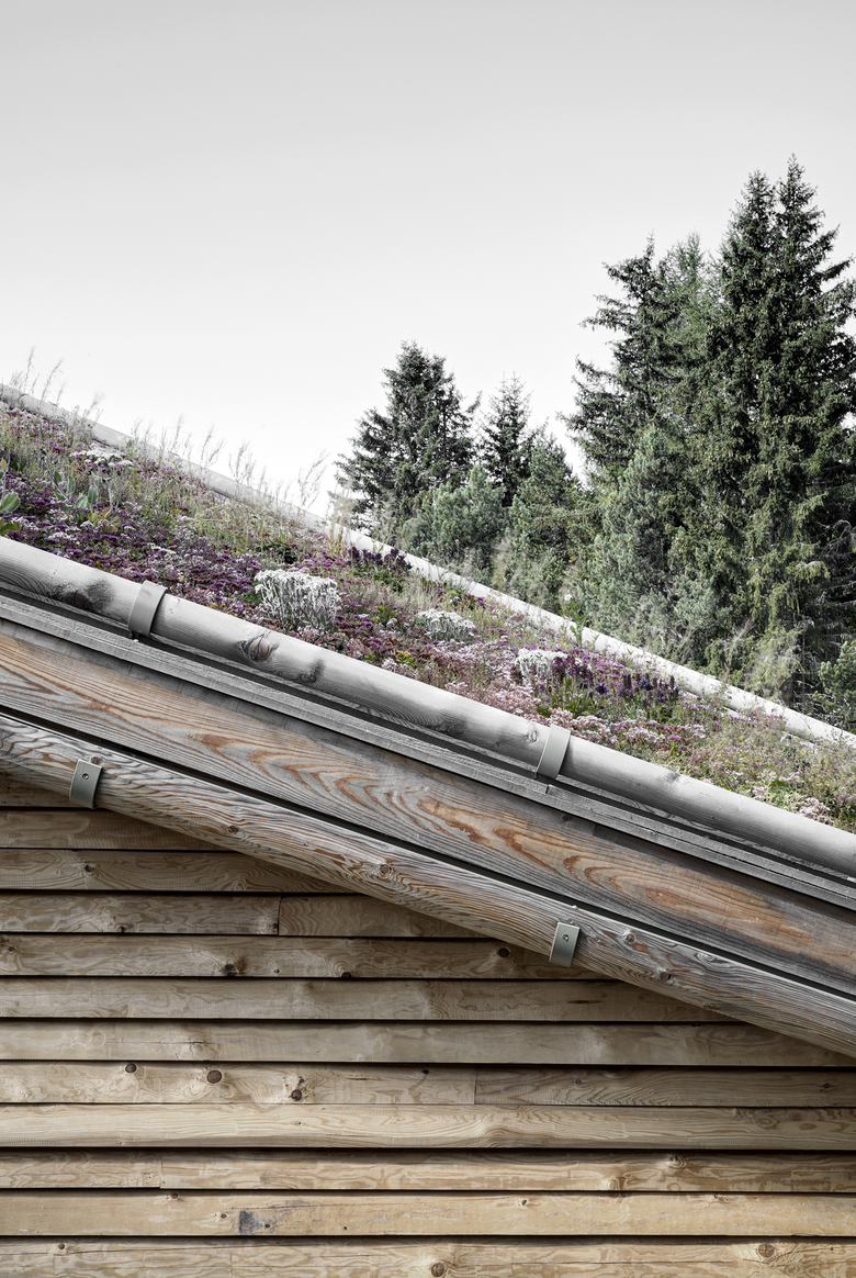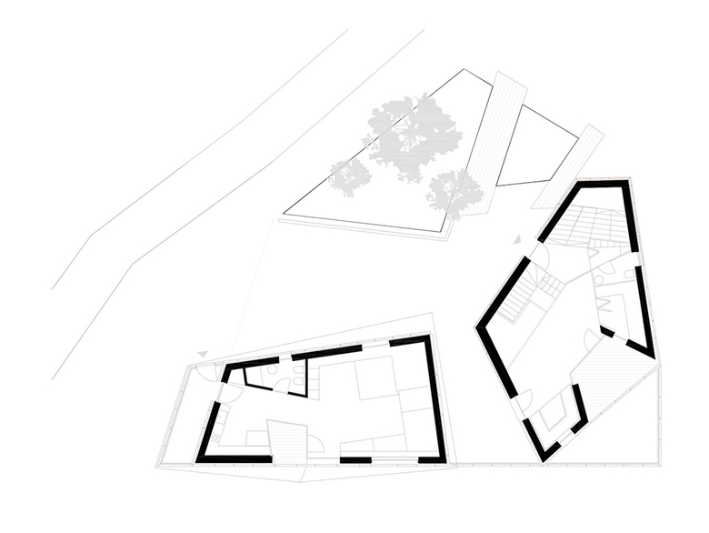 das projekt – fünf ferienwohneinheiten um einen gemeinsamen innenhof gedreht – versucht mit den lokalen gegebenheiten, mit der landschaft, dem ort eins zu werden. anlehnend an die häuser der nachbarschaft werden die traditionellen materialien stein und holz gewählt: naturbelassener stein für den sockelbereich und geviertelte baumstämme für die fassade. das in den hang gesetzte haus folgt der topografie, bricht dort wo es auf die geländekante trifft. ein herauswachsen aus und verwachsen mit der landschaft, eine drehung. durch die positionierung des gebäudes längs der straße entsteht im hinteren bereich eine art hofsituation, eine aussicht richtung lichtung, ein ruhebereich in der natur. der in holz ausgeführte obere teil liegt auf dem sockel (garage) aus stein und richtet sich in höhe und bewegung nach der umgebenden dachlandschaft. das haus sucht nach freiblicken zwischen den nachbarhäusern und gibt weite blicke in die landschaft frei. es entsteht eine bewegung, eine dynamik in der die umgebung miteinbezogen wird, ohne die nachbarhäuser in deren wahrnehmung und deren ausblicke einzuschränken.