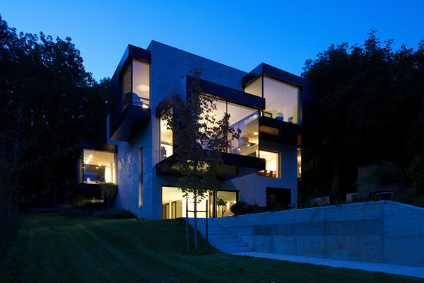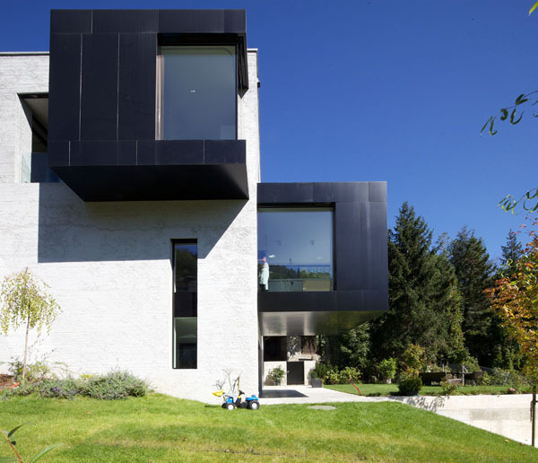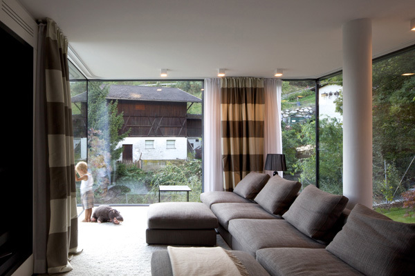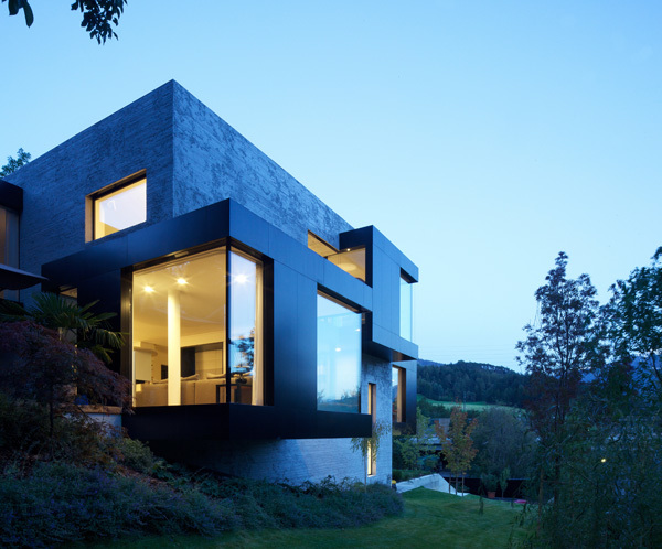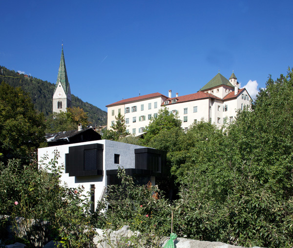 ziel des projektes war es, eine neue wohnqualität zu erzeugen, die sich außen am baukörper ablesen lässt. die verschneidung der einzelnen aus der fassade ragenden raumkörper mit dem basiskubus ergibt eine selbstverständliche zonierung – ein rau verputzter, betonähnlicher grundkörper, dem einzelne volumen hinausgeschnitten bzw. hinzugefügt sind. es entstehen geschützte lichthöfe und die charakteristischen großen „erker“, eine abstraktion eines für südtirol typischen baudetails. in ihren glasscheiben und schwarz glänzenden metallrahmen spiegeln sich landschaft, wolken und bäume des grundstückes, wodurch das gebäude teil der umgebenden natur wird. in den kubus eingeschnittene innenhöfe verstärken das gefühl des lebens mit und in der natur.