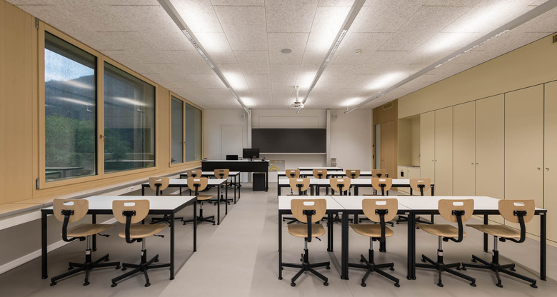 Erste zertifiziertes Energiehaus im Kanton – Das Berufs- und Weiterbildungszentrum des Kantons Uri wurde mit einem nachhaltig konzipierten Pavillonneubau erweitert. Der schlichte kubische Bau nimmt die Massstäblichkeit der umliegenden Bebauung auf. Er ist komplett als Holzbau konzipiert. Der Elementbau zeigt sich in der Fassade, welche sich dezent an die angrenzenden Gebäudekörper anpasst. Die Klassenzimmer sind von der Gesamtstruktur geprägt. Die Fenster weisen eine tiefe Brüstung auf, da der Sichtbezug der Schüler in den Aussenraum wichtig ist. Zwischen zwei Schulzimmer befindet sich jeweils ein Gruppenraum, welcher mittels verglasten Faltschiebetüren schliessbar ist. Die Fassade ist mit Lucido® Elementen verkleidet. Die thermoaktive Fassade schützt das Haus vor Wärmeverlust und gewinnt thermische Energie.