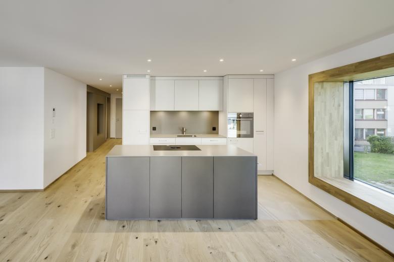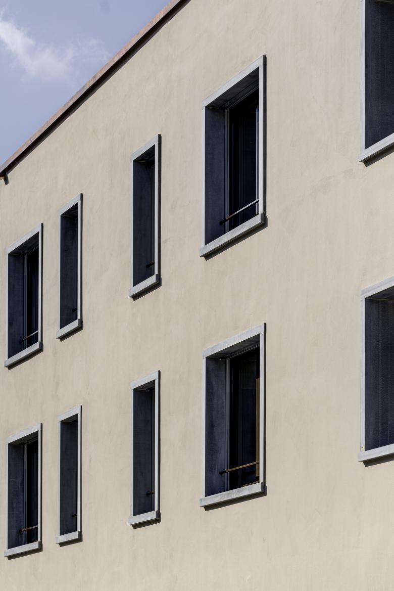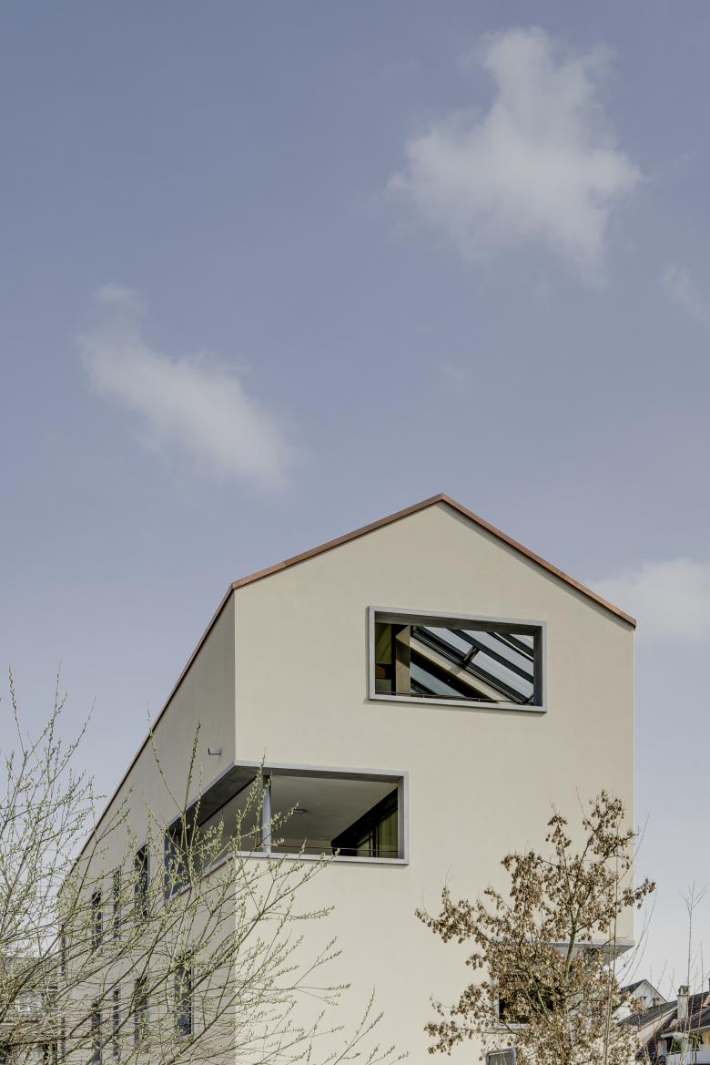 Die Setzung des Baukörpers verleiht dem Ort eine klare Identität. Das Volumen passt sich präzise in den Perimeter ein und orientiert sich in der Grösse an den umliegenden Bauten. In der Länge wird das Gebäude durch das konisch zulaufende Volumen und den dadurch entstehenden Knick in der Fassade beidseitig gegliedert. Mit den daraus resultierenden schmalen Giebelfassaden wirkt das Gebäude optisch kleiner. Mit dem Satteldach wird die intakte Dachlandschaft der Altstadt im äusseren Ortskern sowie der umliegenden historischen Bauten fortgeführt. Durch die konische Gebäudeform entstehen auch unterschiedliche Traufhöhen, ähnlich wie man sie bei den gegenüberliegenden Altstadtbauten mit ihren verschiedenen Höhen findet. Das Spiel mit den Traufhöhen und die schlichte Ausgestaltung des Dachrandes verleihen dem Gebäude eine moderne Formensprache. Die Fassadengestaltung des Neubaus orientiert sich am bestehenden Gebäude und der ortstypischen Bauweise. Die Wohnungen darüber haben eine Lochfassade und Loggias. Das Gebäude am Grabenweg ist im Sinn einer nachhaltigen Bauweise als monolitisches Einsteinmauerwerk konstruiert.