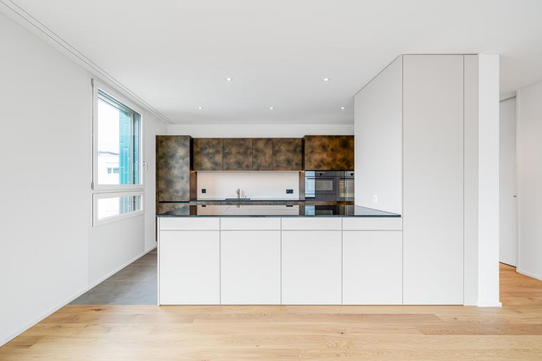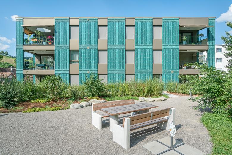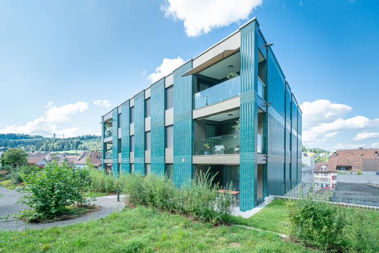 Der Aspekt der Nachhaltigkeit spielte bei der Planung eine wesentliche Rolle. Das Flachdach wird mit einer Photovoltaikanlage zur Energiegewinnung bestückt. Ein intelligentes Energiemanagementsystem misst den Energieverbrauch in Echtzeit und ist jederzeit mittels einer App einsehbar auf einem Smartphone, Tablet oder Computer. Das Gebäude wird zentral mit einer Wärmepumpe via Erdwärmesonden beheizt. Die Gebäudefassade, verkleidet mit Keramikplatten, setzt mit der aussergewöhnlichen Materialisierung ein klares Zeichen. Die cleveren Grundrisse bieten ein grosszügiges Raumgefühl.