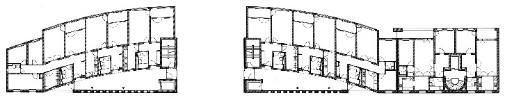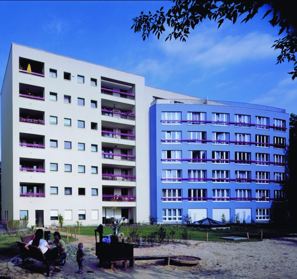 Als Reaktion auf den Straßenlärm sind die beiden neuen Gebäude aus zwei Körpern zusammengesetzt: Ein geschlossener Rigel mit Laubengängen und Nebenräumen bildet einen Puffer zur Straße. Aus diesem schiebt sich ein bogenförmiges Bauteil, dessen Wohnbereiche überwiegend zum ruhigeren Blockinnenraum orientiert sind. Die konsequente Symmetrie und stark skulpturale Wirkung machen die Anlage zum neuen Tor der historischen "Fliegersiedlung".